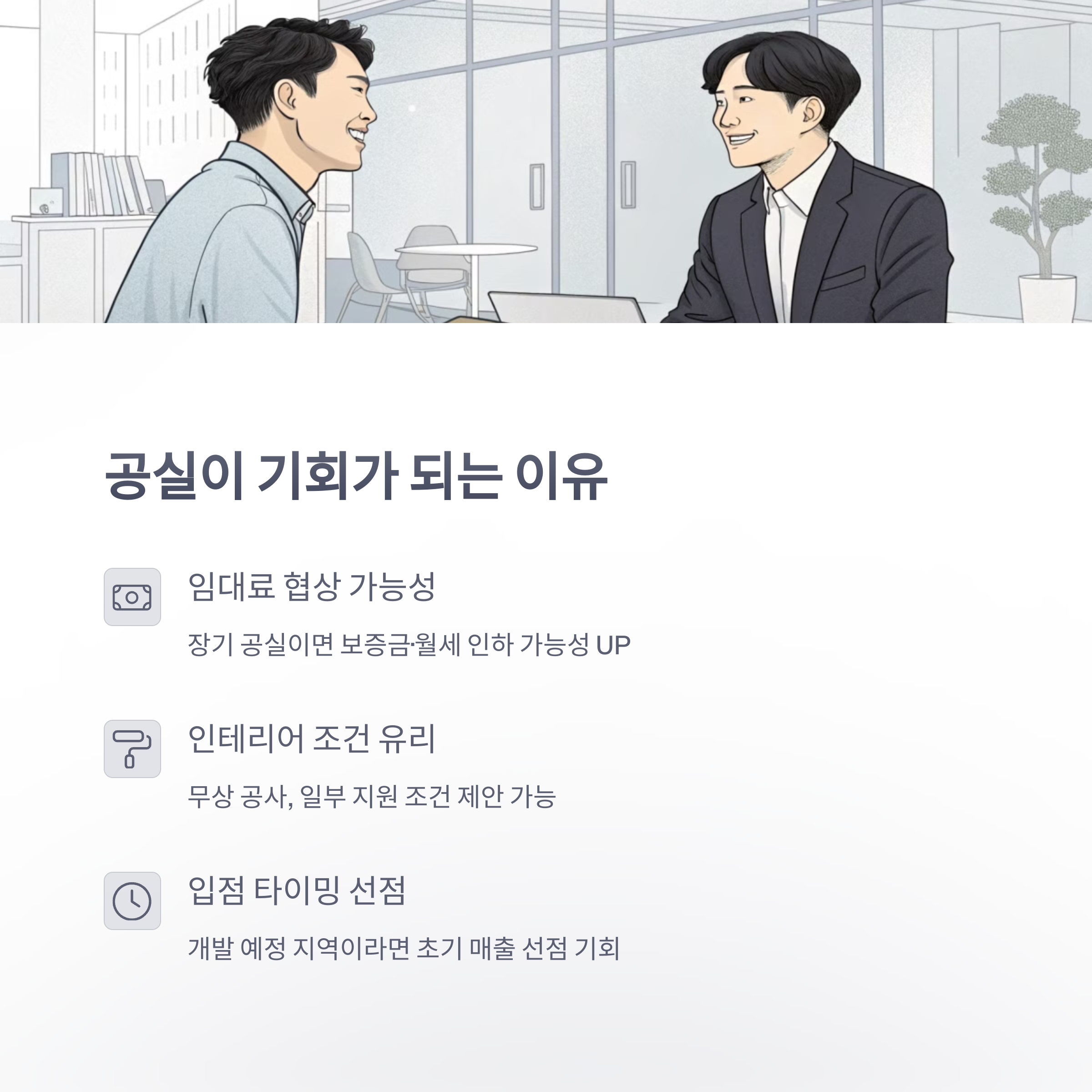 - 임대료 협상 가능성: 장기 공실이면 보증금·월세 인하 가능성 UP