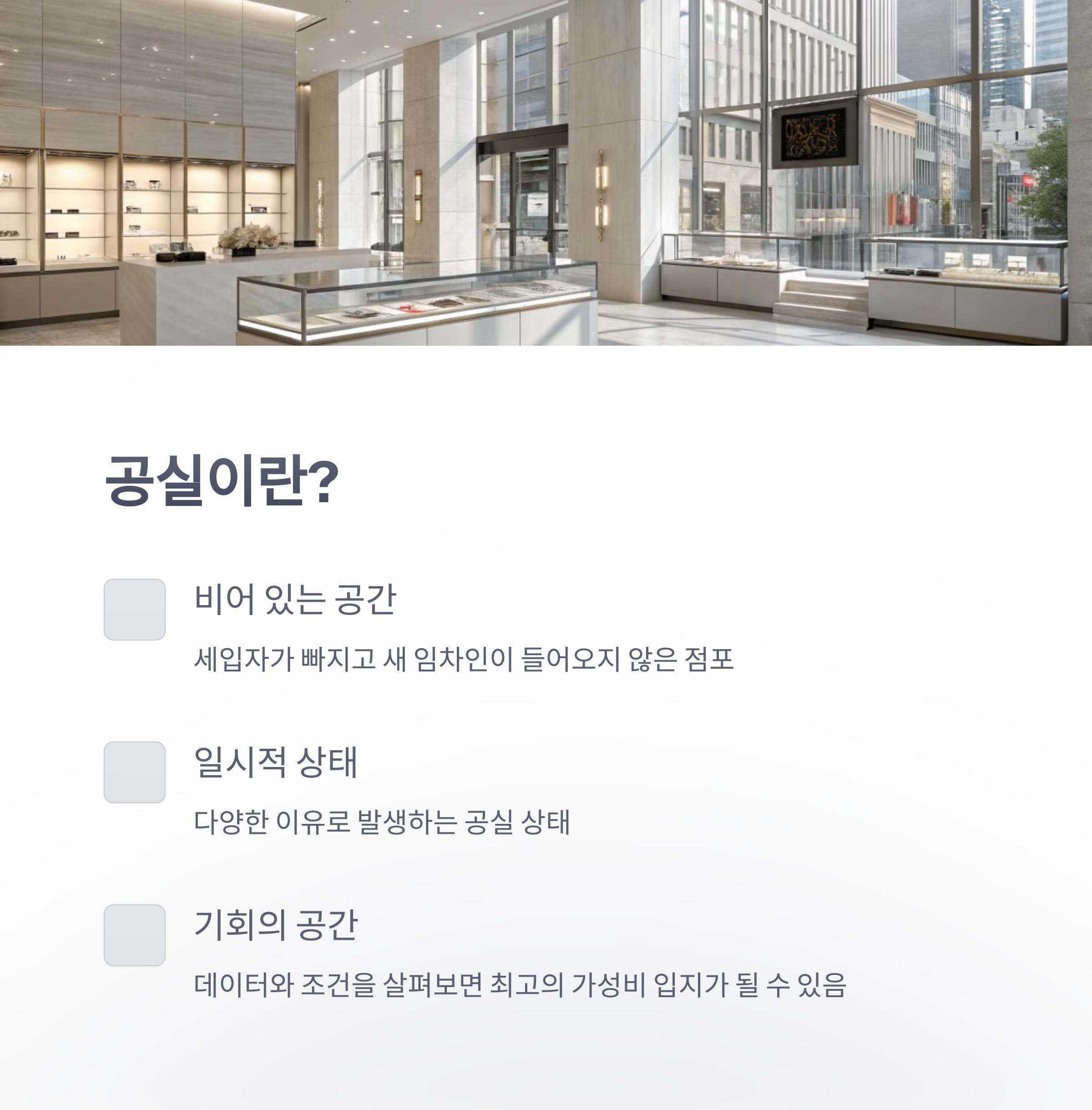 저도 창업 초기에 점포 알아볼 땐 '공실'이라는 단어만 들어도 무섭게 느껴졌어요. “장사 안 돼서 비었겠지...” 싶은 생각이 먼저 들었거든요. 근데 시간이 지나고 다양한 매물을 보다 보니, 오히려 공실이라는 단어에 기회가 숨어있다는 걸 알게 됐죠.