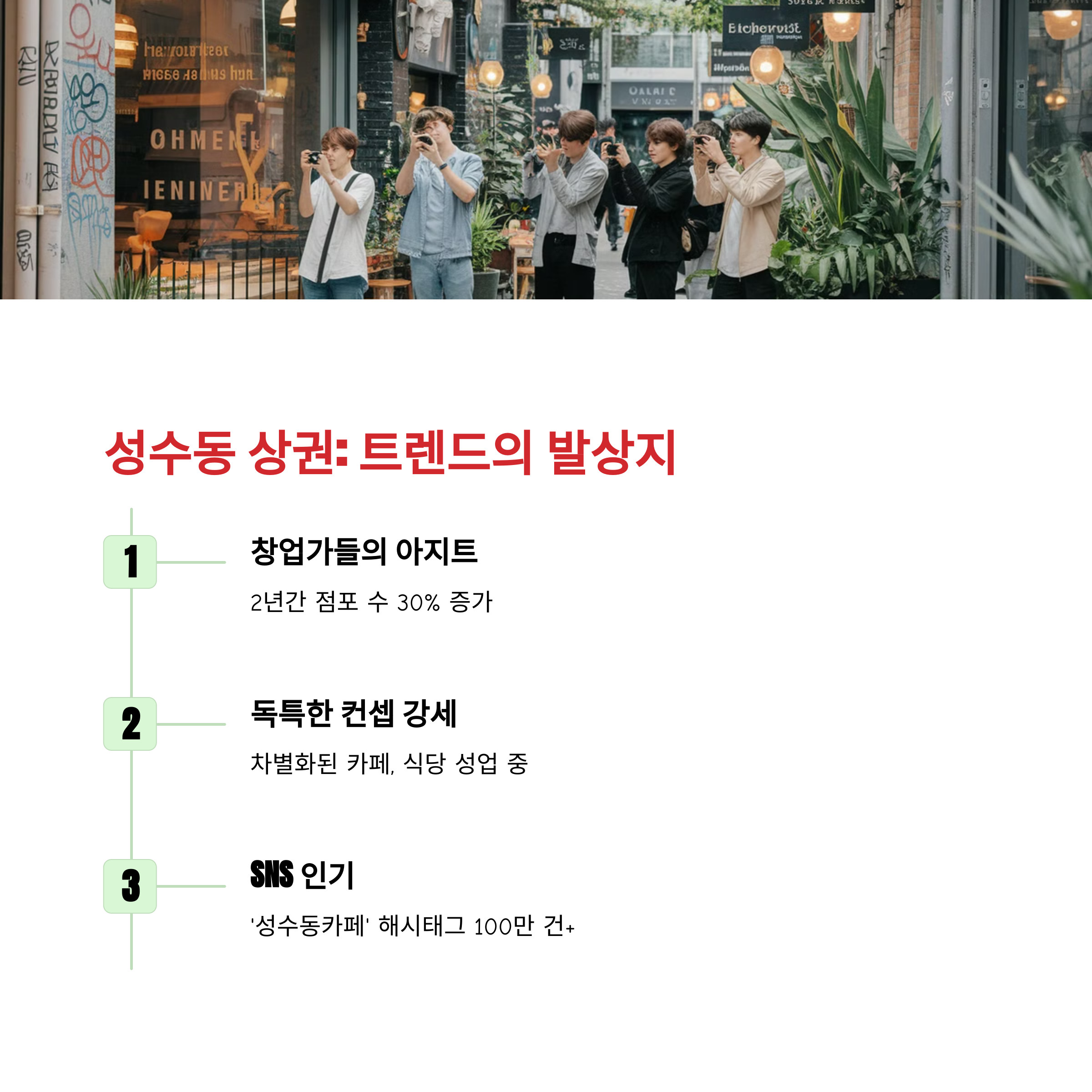 성수동은 트렌디한 브랜드들이 모여 있는 '서울의 브루클린'으로 불리는 곳입니다. 개성 있는 카페, 아트 갤러리, 소규모 브랜드 쇼룸이 성장하는 상권입니다.