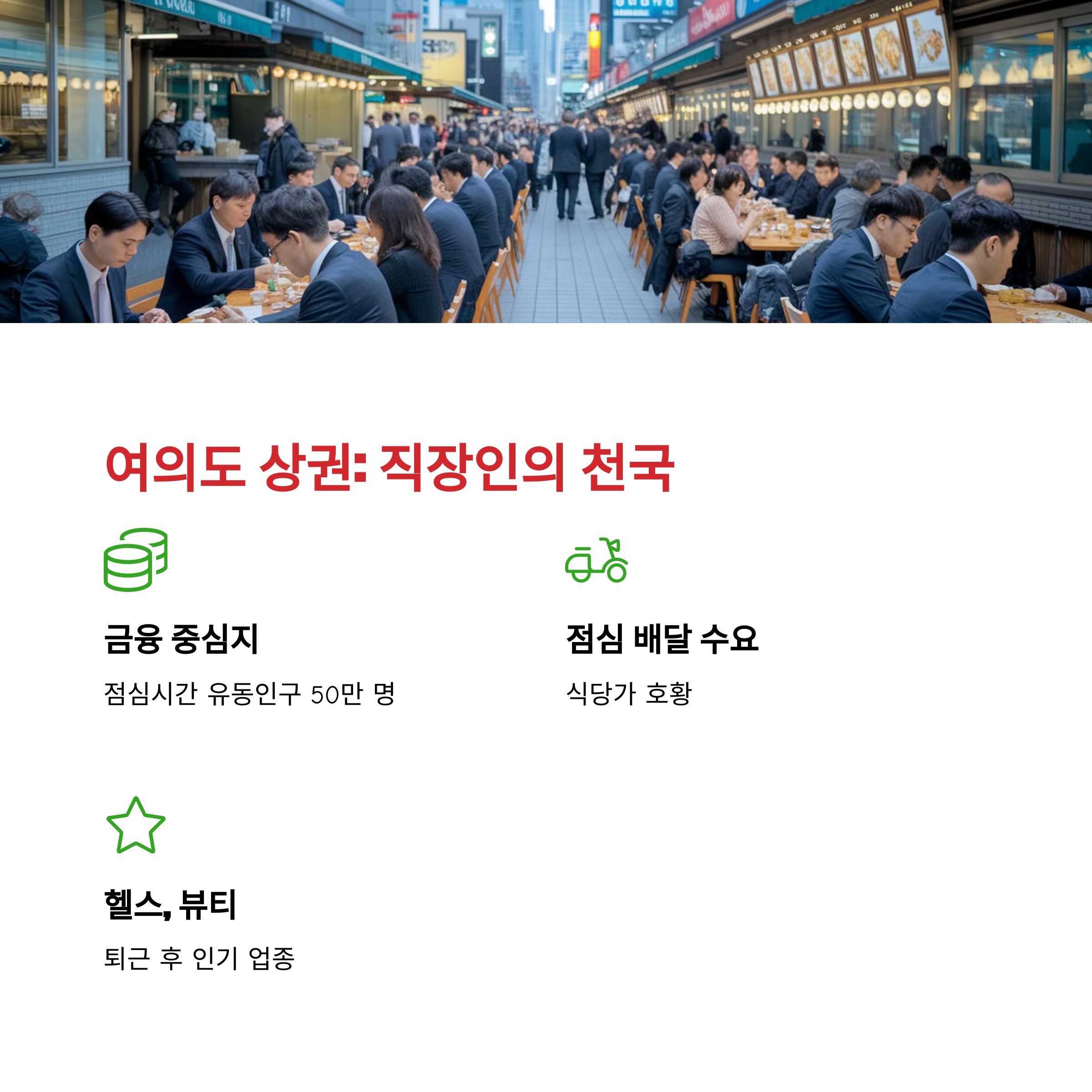 여의도는 금융 중심지로 대기업, 증권사, 공기업 등이 몰려 있는 대표적인 직장인 상권입니다. 점심시간과 퇴근 후 소비가 집중되므로, 빠른 회전율을 갖춘 업종이 유리합니다.