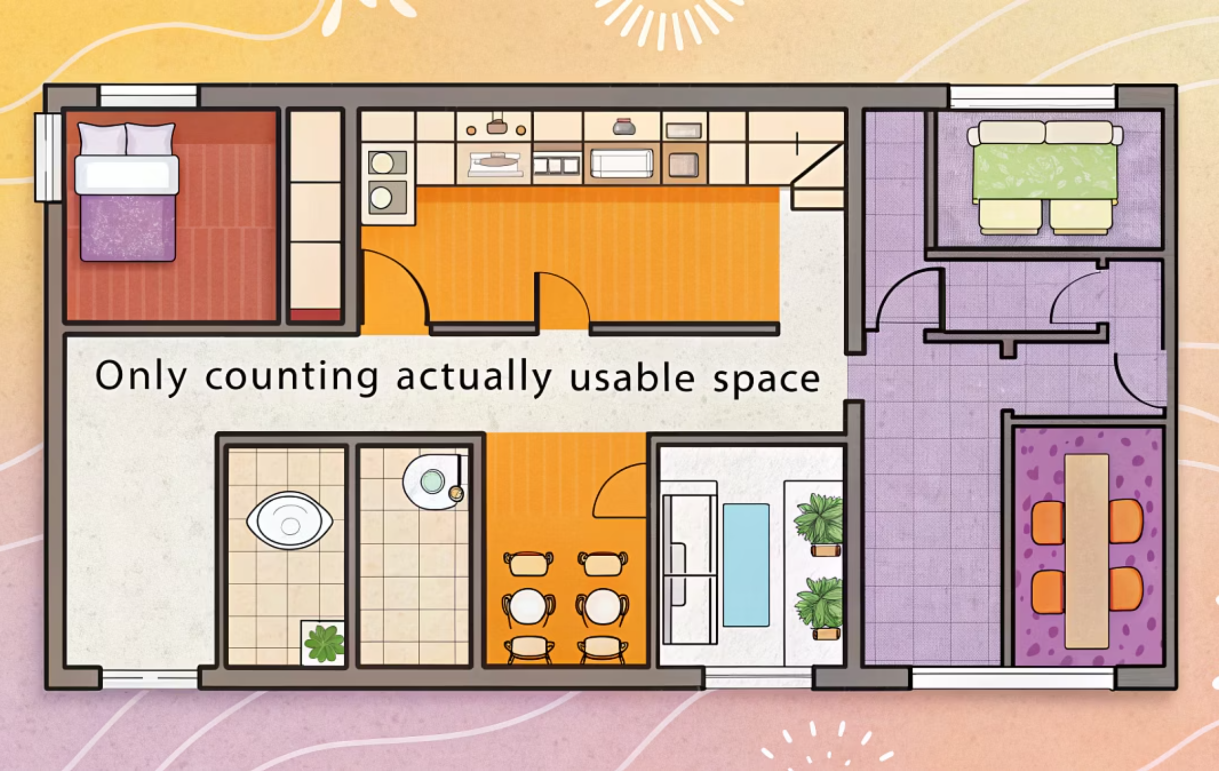 실면적은 말 그대로 내가 실제로 발을 딛고 사용할 수 있는 바닥 면적을 뜻합니다. 벽이나 기둥, 복도, 엘리베이터 공간처럼 직접 사용하지 못하는 공간은 제외하고 계산되는 것이 특징입니다. 예를 들어, 아파트에서 우리가 실제로 거실, 방, 주방, 욕실 등 생활하는 공간의 넓이를 의미한다고 보면 됩니다.
