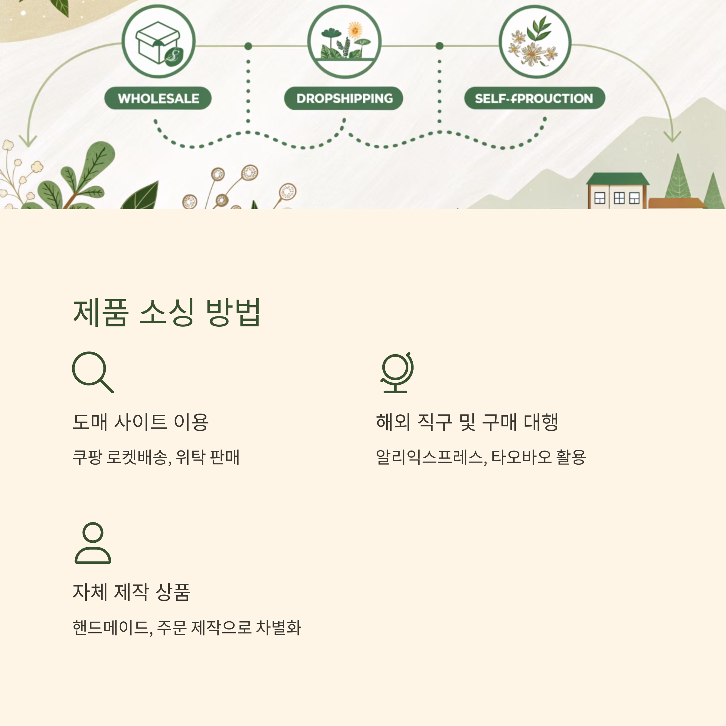- 도매 사이트 이용: 쿠팡 로켓배송, 위탁 판매(사입 없이 운영 가능)