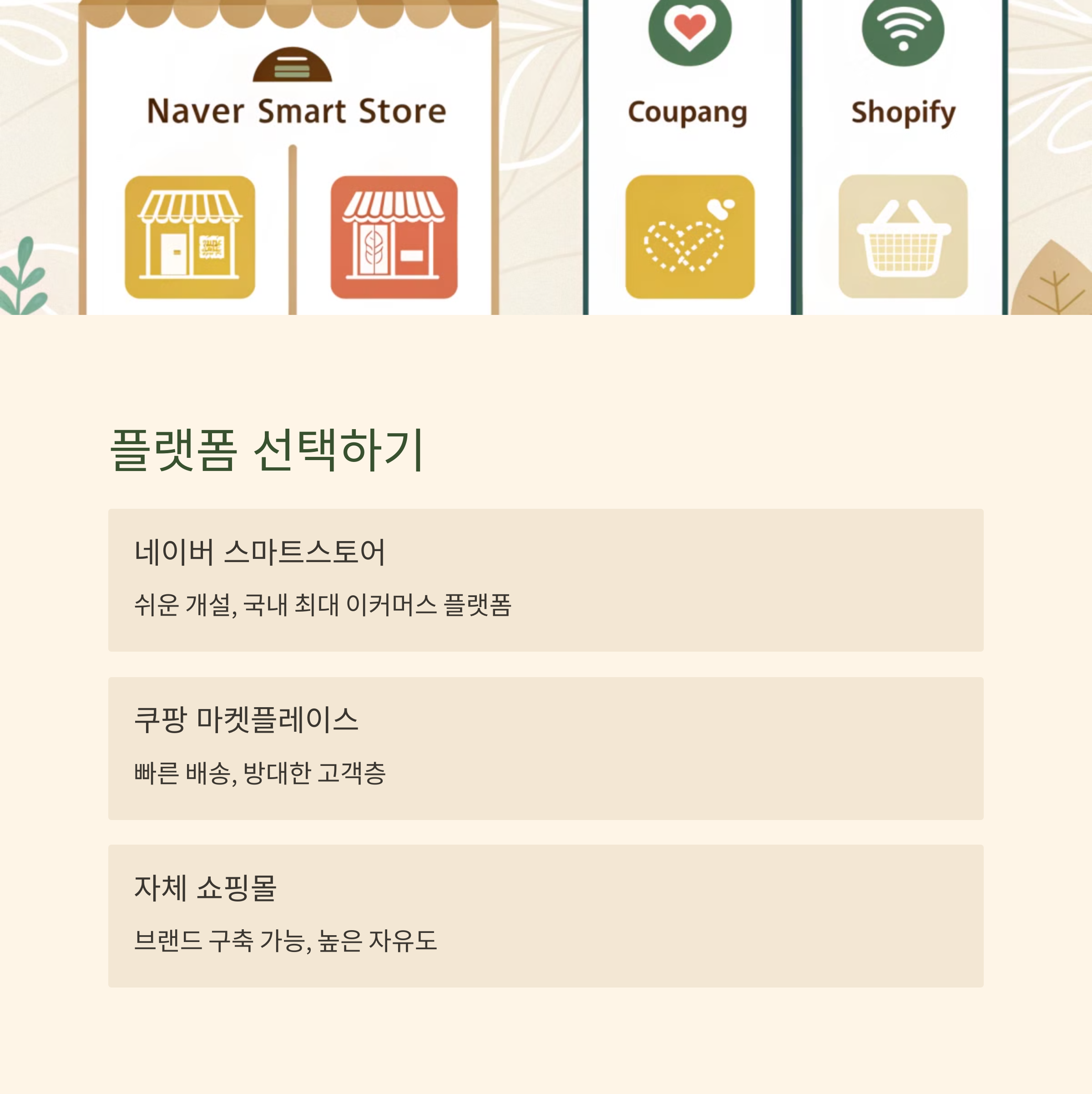 초보자는 네이버 스마트스토어나 쿠팡 마켓플레이스를 추천합니다. 이들은 별도의 초기 비용 없이 개설할 수 있으며, 고객 유입이 상대적으로 쉽기 때문에 안정적인 운영이 가능합니다.
