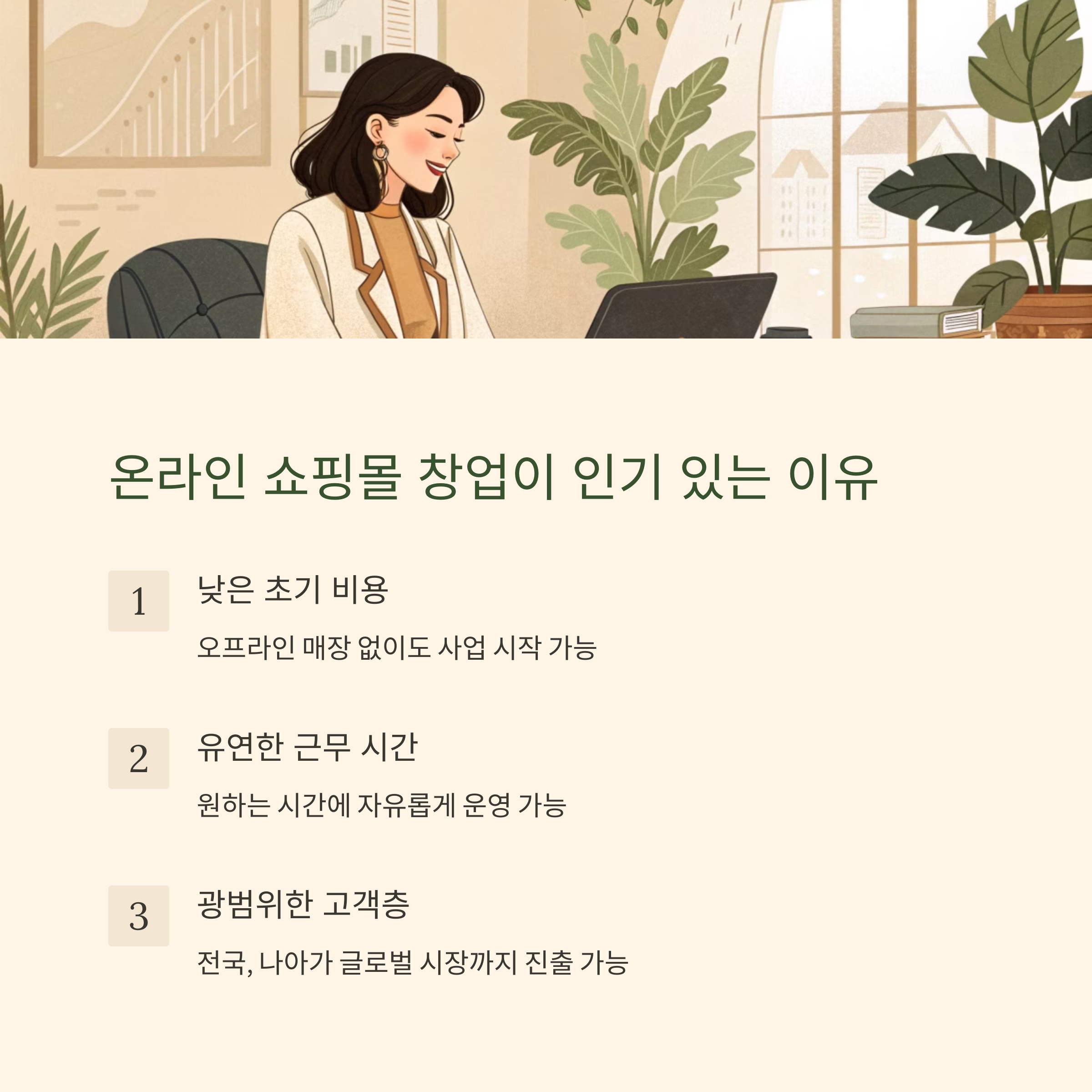- 낮은 초기 비용: 오프라인 매장 없이도 사업 시작 가능