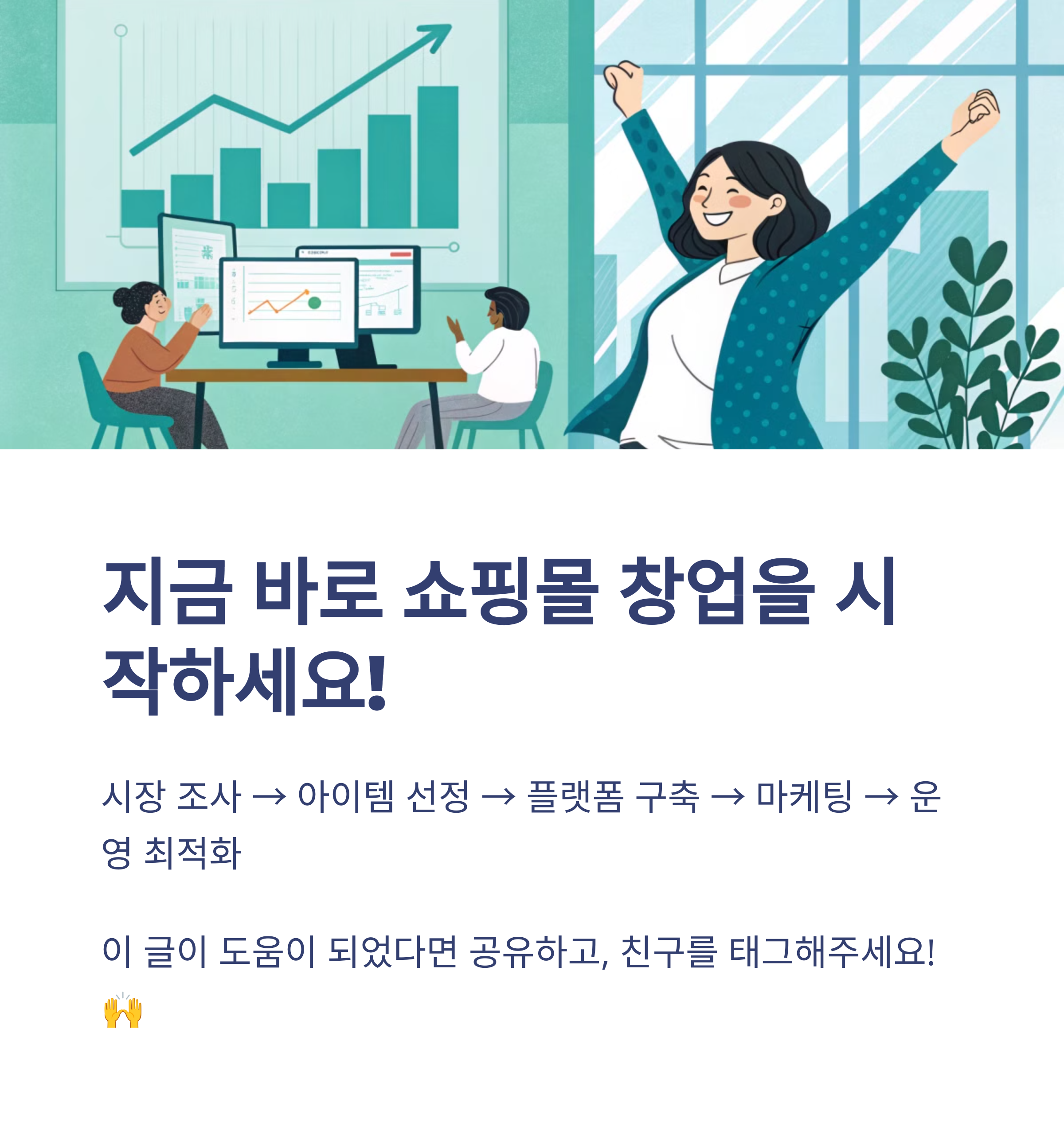 온라인 쇼핑몰 창업은 누구나 도전할 수 있지만, 성공하기 위해서는 체계적인 준비가 필요합니다. 시장 조사 → 아이템 선정 → 플랫폼 구축 → 마케팅 → 운영 최적화 이 순서를 잘 따라가면 보다 빠르고 안정적으로 쇼핑몰을 성장시킬 수 있습니다.