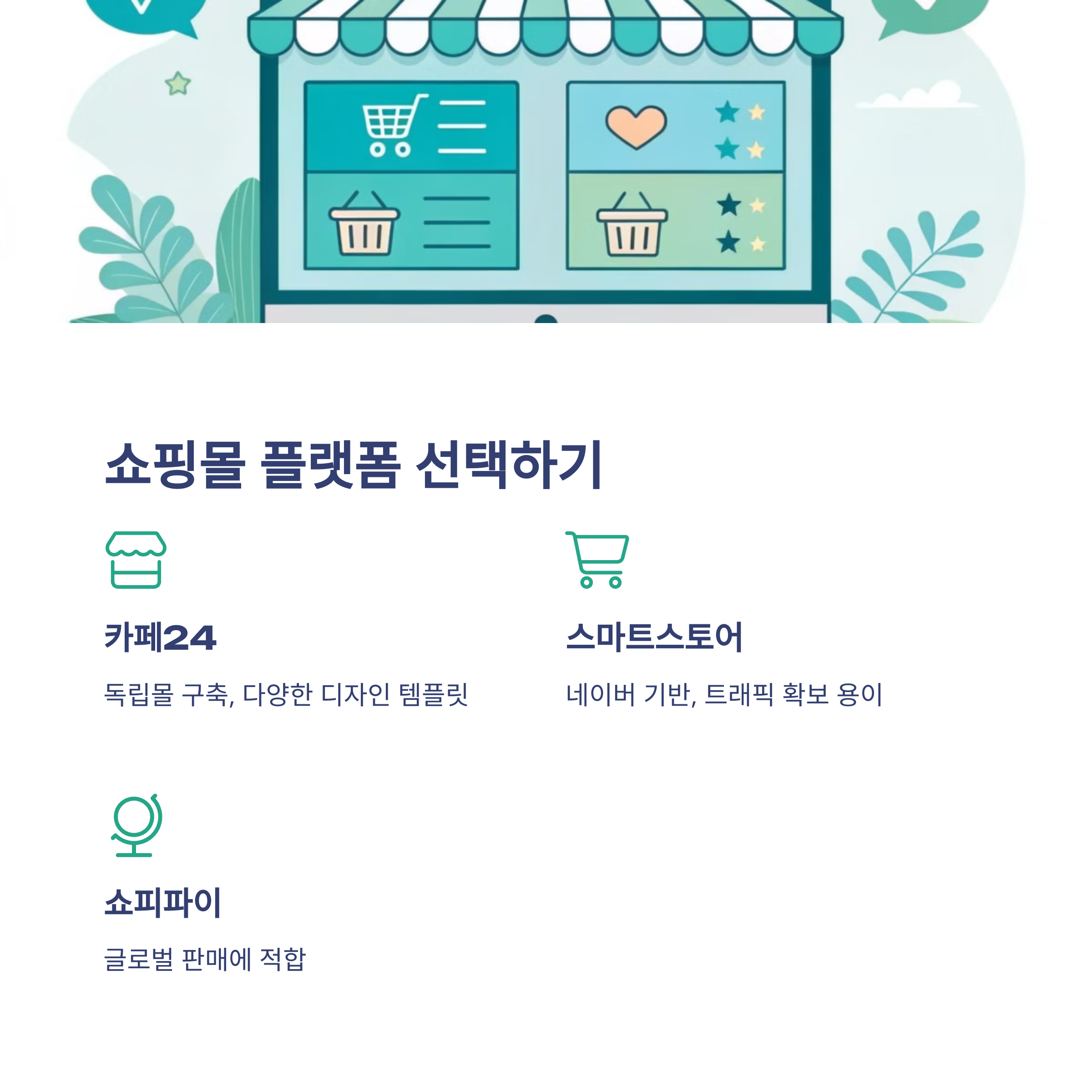 - 카페24: 독립몰 구축 가능, 다양한 디자인 템플릿 제공