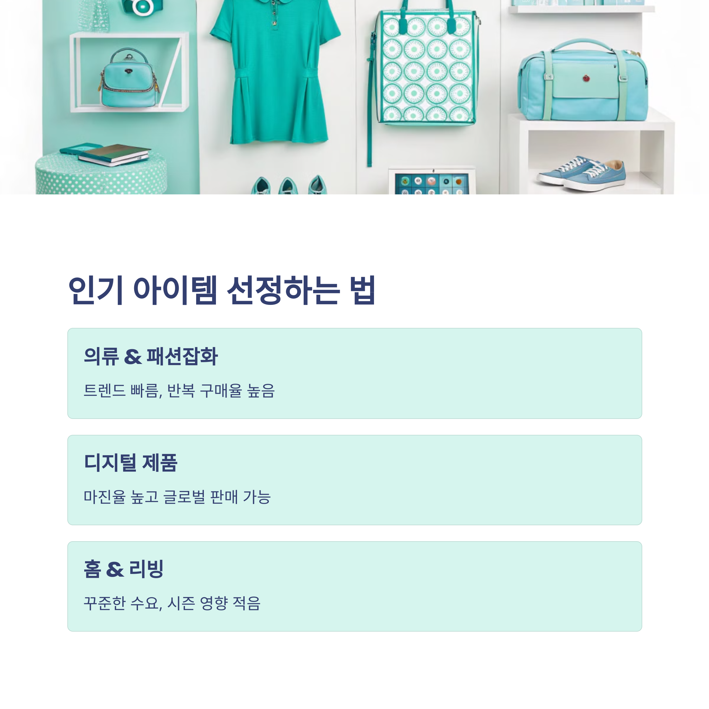 | 홈 & 리빙 용품 | 꾸준한 수요가 있으며 시즌 영향이 적음 | 부피가 커서 배송비 부담이 있음 |