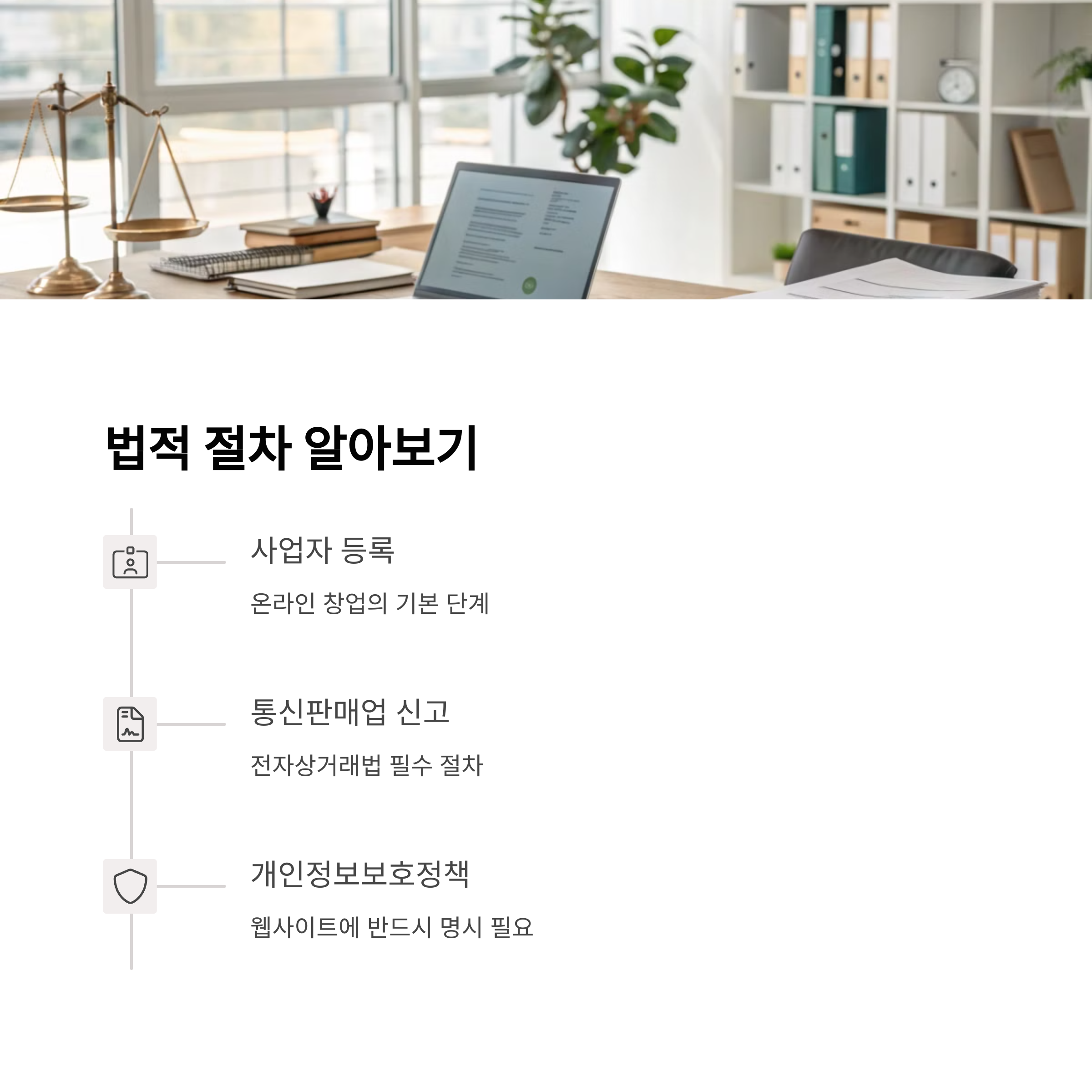 사업자 등록은 기본이고, 통신판매업 신고와 개인정보보호정책 명시 등 전자상거래법을 꼭 숙지해야 합니다.