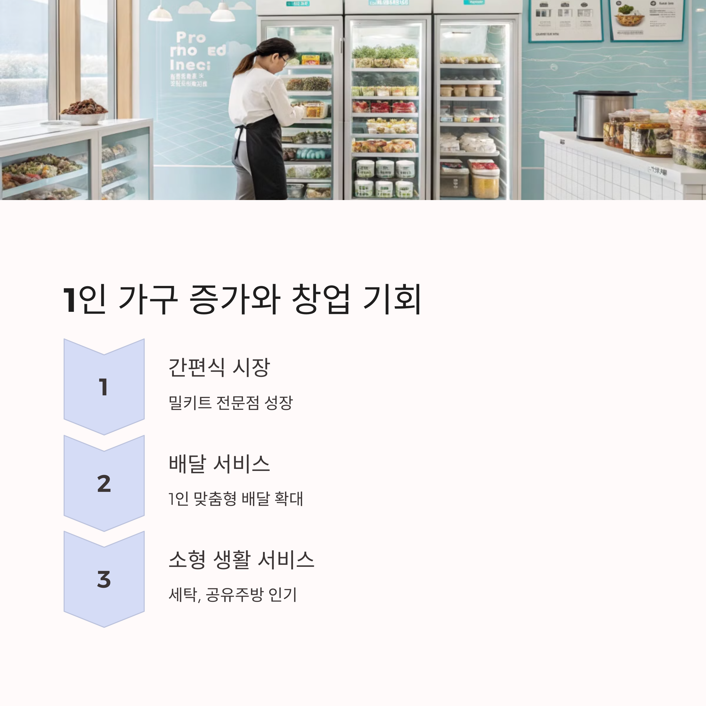1인 가구가 늘어나면서 밀키트 전문점, 소형 생활가전 대여 서비스, 1인 맞춤형 헬스케어 서비스 등이 유망합니다. 특히 편의성과 개인 맞춤형 서비스를 제공하는 것이 중요합니다.