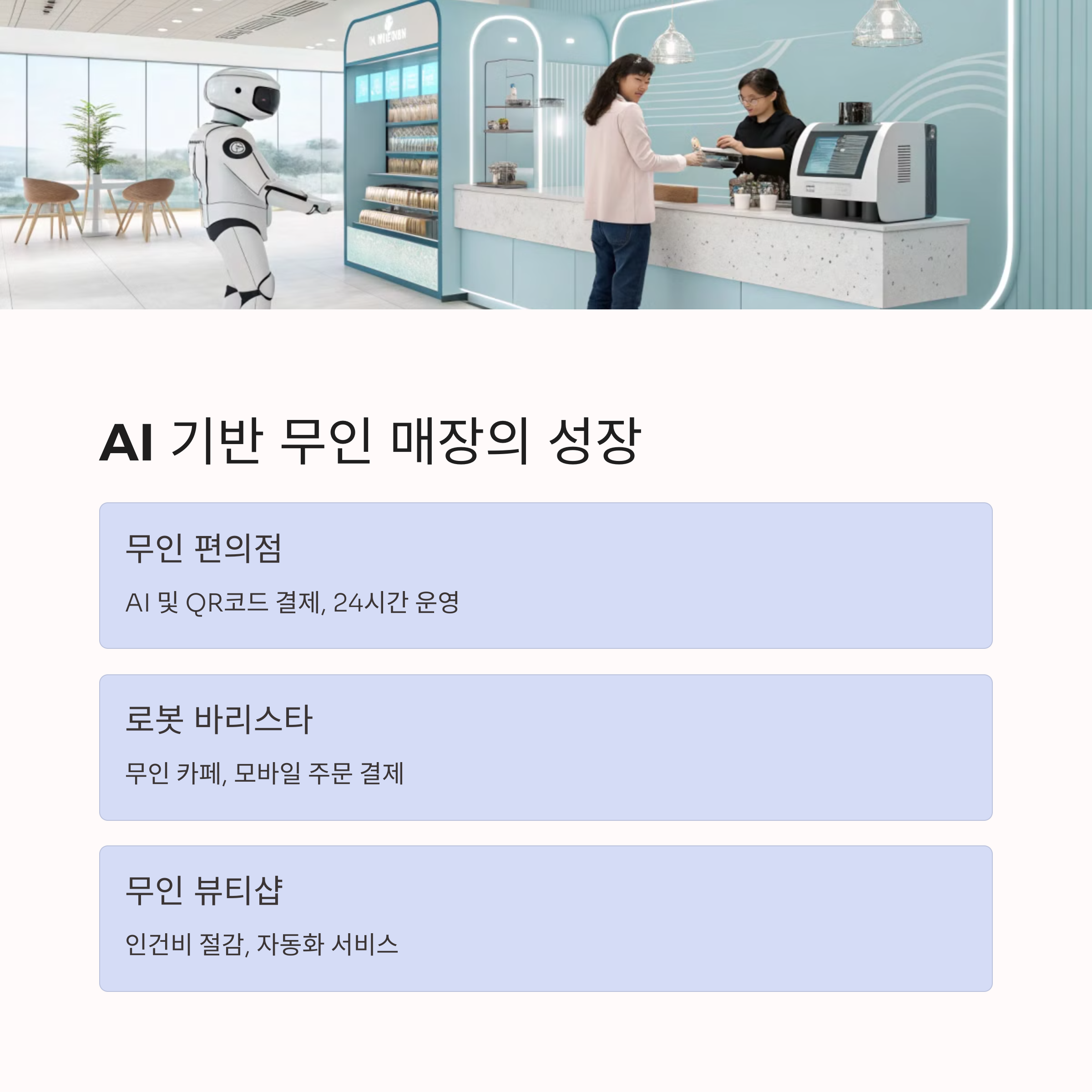 최근 몇 년 사이 AI 기반 무인 매장이 빠르게 확산되고 있습니다. 인건비 상승과 24시간 운영의 필요성이 맞물리면서 AI 키오스크, 로봇 서비스 등을 활용한 비즈니스 모델이 주목받고 있죠. 특히, 편의점과 카페뿐만 아니라 무인 뷰티샵, 헬스케어 센터 등 다양한 업종에서도 무인화 기술이 적용되고 있습니다.