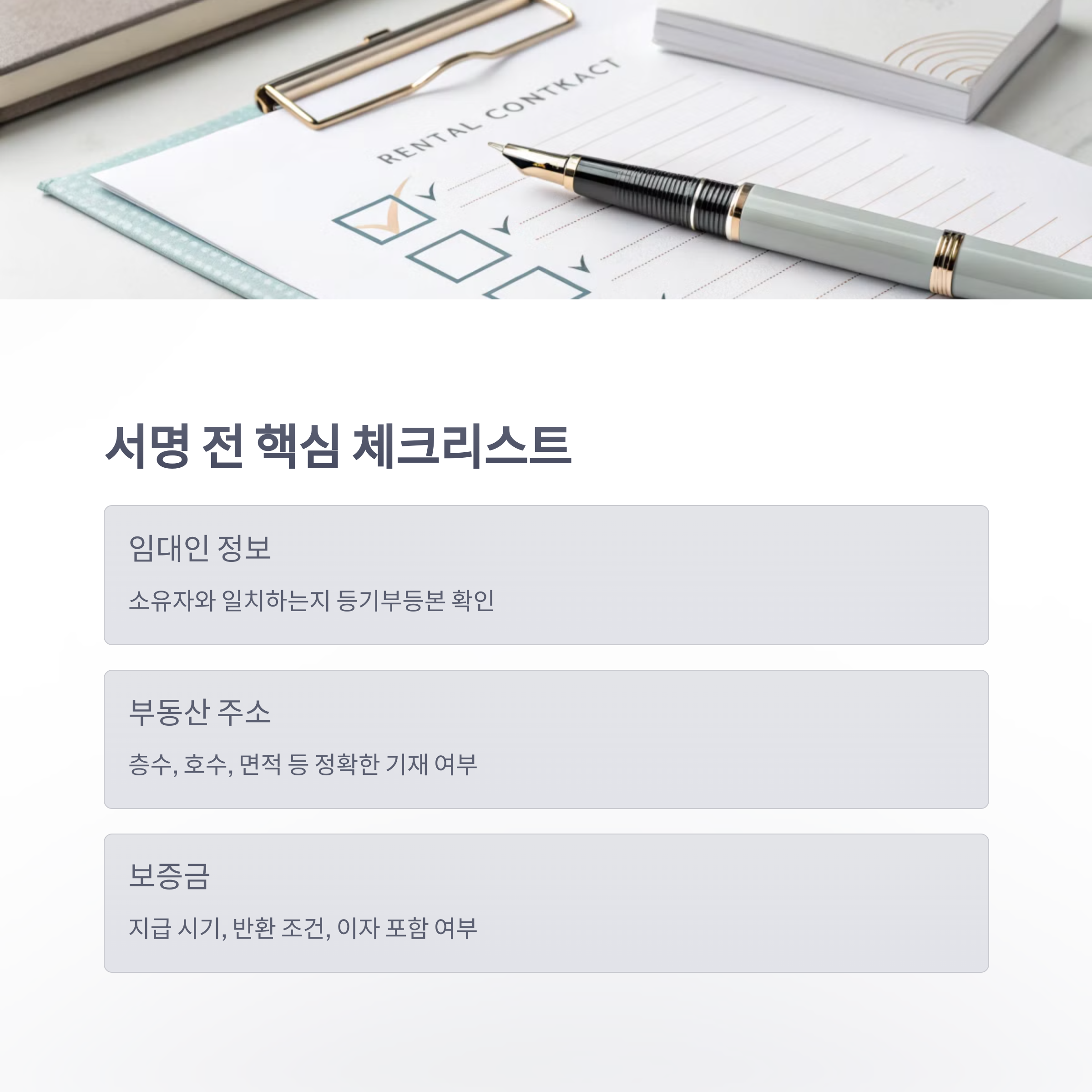 계약서에 서명한 순간부터 법적 효력이 발생하기 때문에, 내용을 하나라도 놓치면 나중에 문제 될 수 있어요. 아래 체크리스트는 실제 임대차계약을 체결하기 전 꼭 확인해야 할 항목들을 정리한 것입니다.