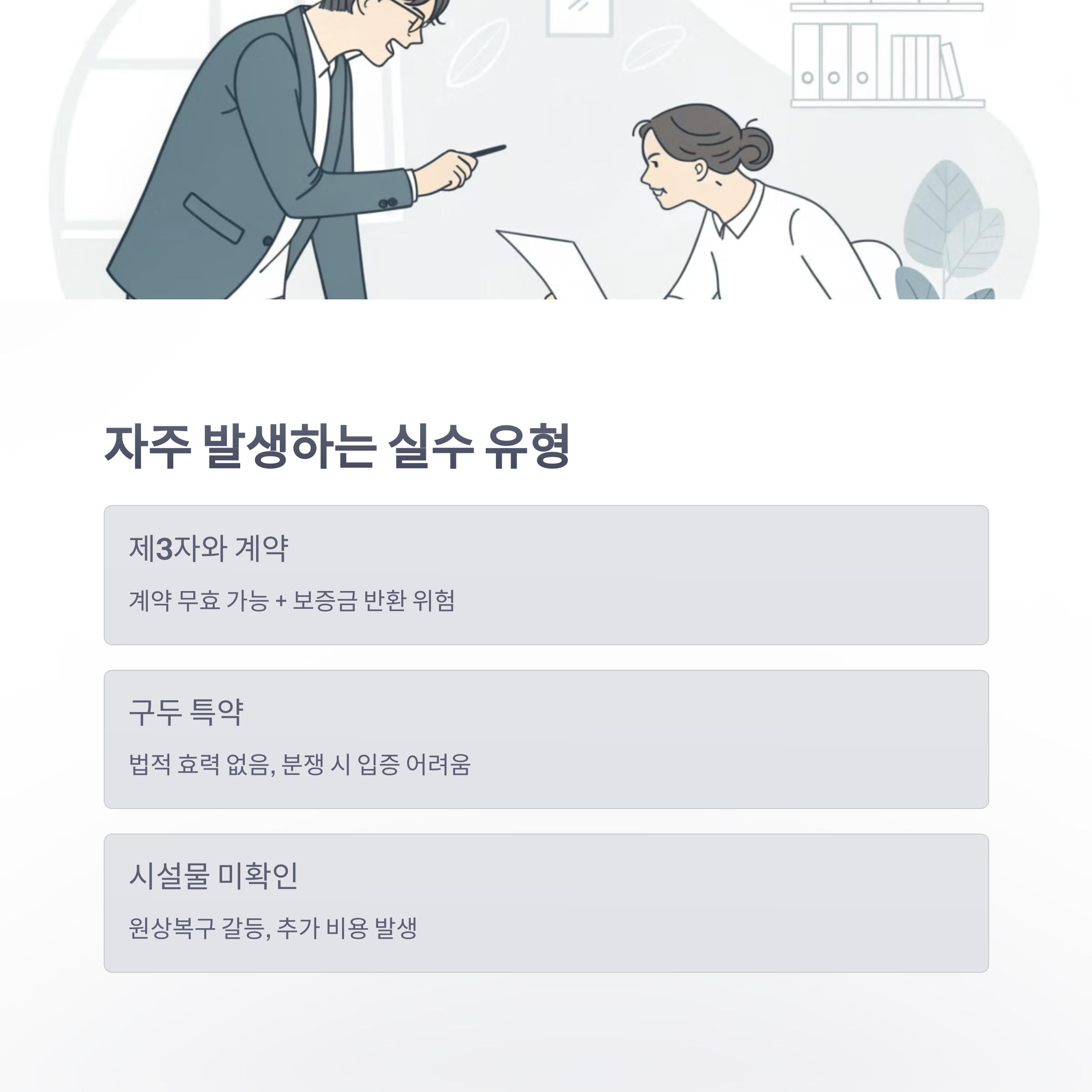 임대차계약에서 실수는 곧 손해로 이어집니다. 특히 처음 계약하는 경우 아래와 같은 오류를 자주 범하게 됩니다. 아래 실수 사례를 미리 알고 있다면 훨씬 안전하게 계약을 진행할 수 있어요.
