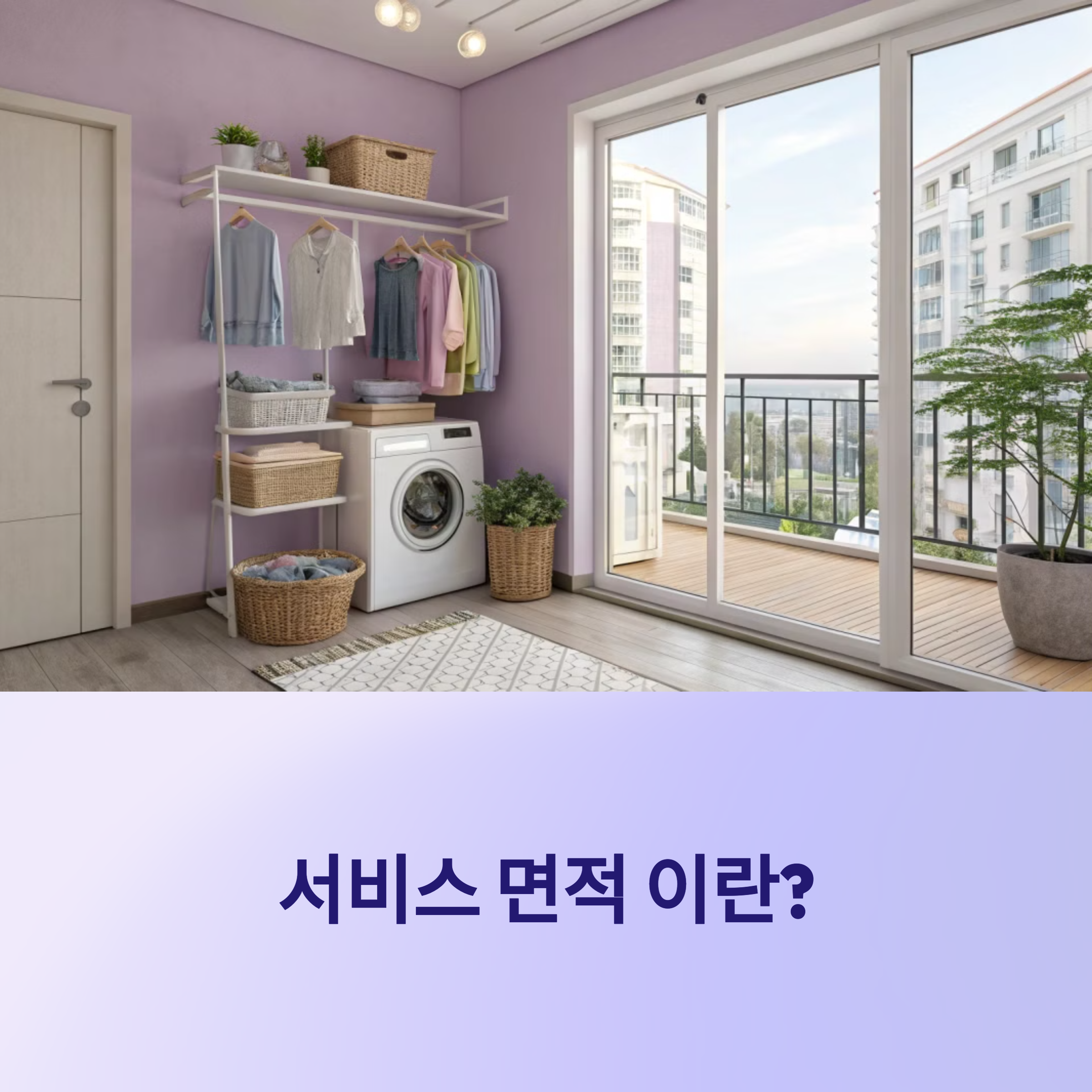 전용면적 외에도 '서비스 면적'이라는 개념이 있습니다. 말 그대로 법적으론 포함되지 않지만, 실생활에선 활용되는 공간을 말하는데요. 예를 들어 아파트의 확장형 발코니나 세탁실 공간 등입니다.