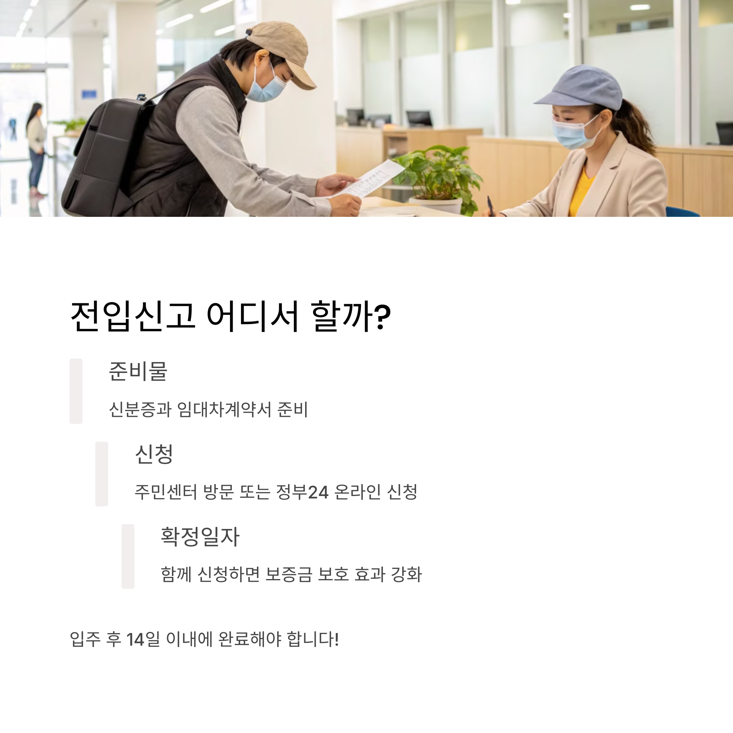 - 전입신고는 입주 후 14일 이내에 완료해야 대항력 확보