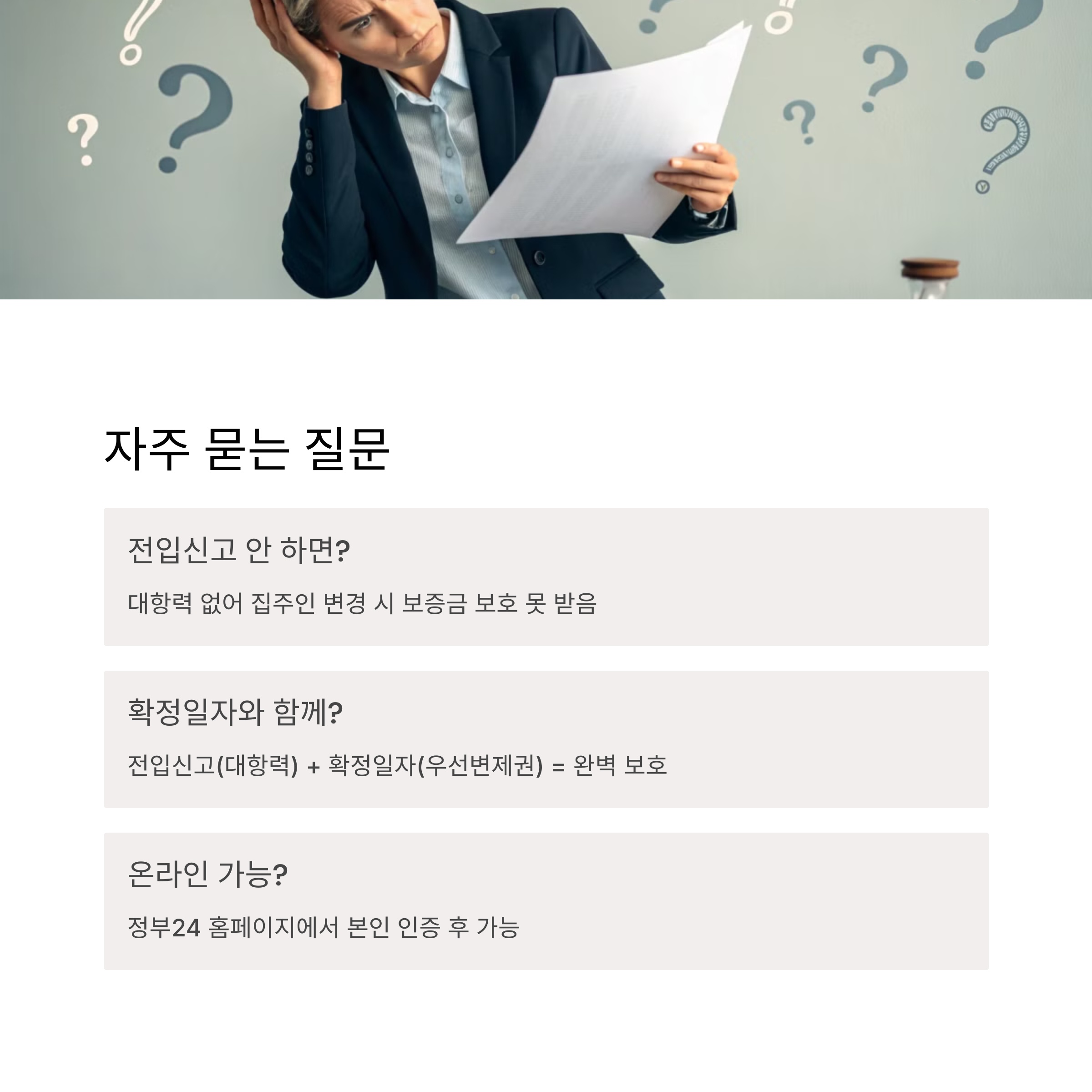 전입신고로 대항력을 얻고, 확정일자로 우선변제권을 확보하면 보증금 보호가 완성됩니다. 반드시 함께 진행하는 것이 좋습니다.