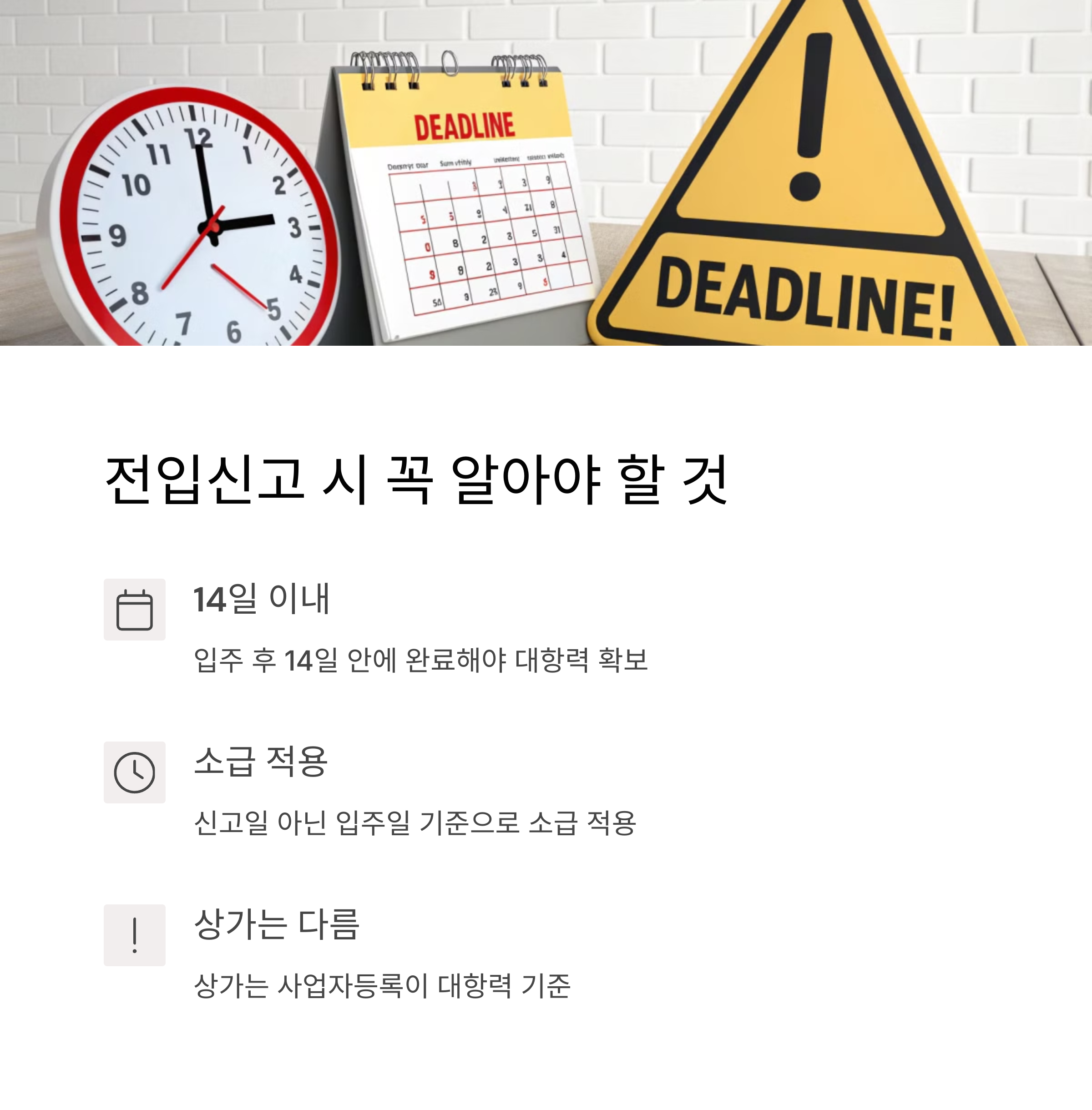 • 전입신고는 입주 후 14일 이내에 완료해야 대항력 확보