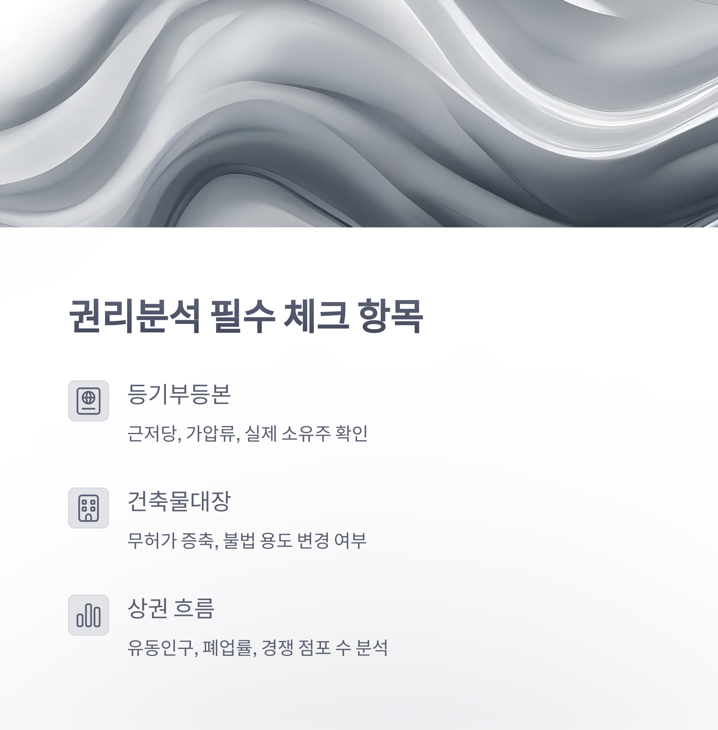점포 권리분석은 상가나 점포 계약 전에 법적·재정적 문제 유무를 미리 조사하는 과정입니다. 겉으로 보기엔 인테리어도 그럴싸하고 임대료도 저렴한데, 실제론 건물주 체납세금, 등기부상 근저당, 무허가 구조 변경 등 잠재적인 리스크가 숨어 있을 수 있습니다.