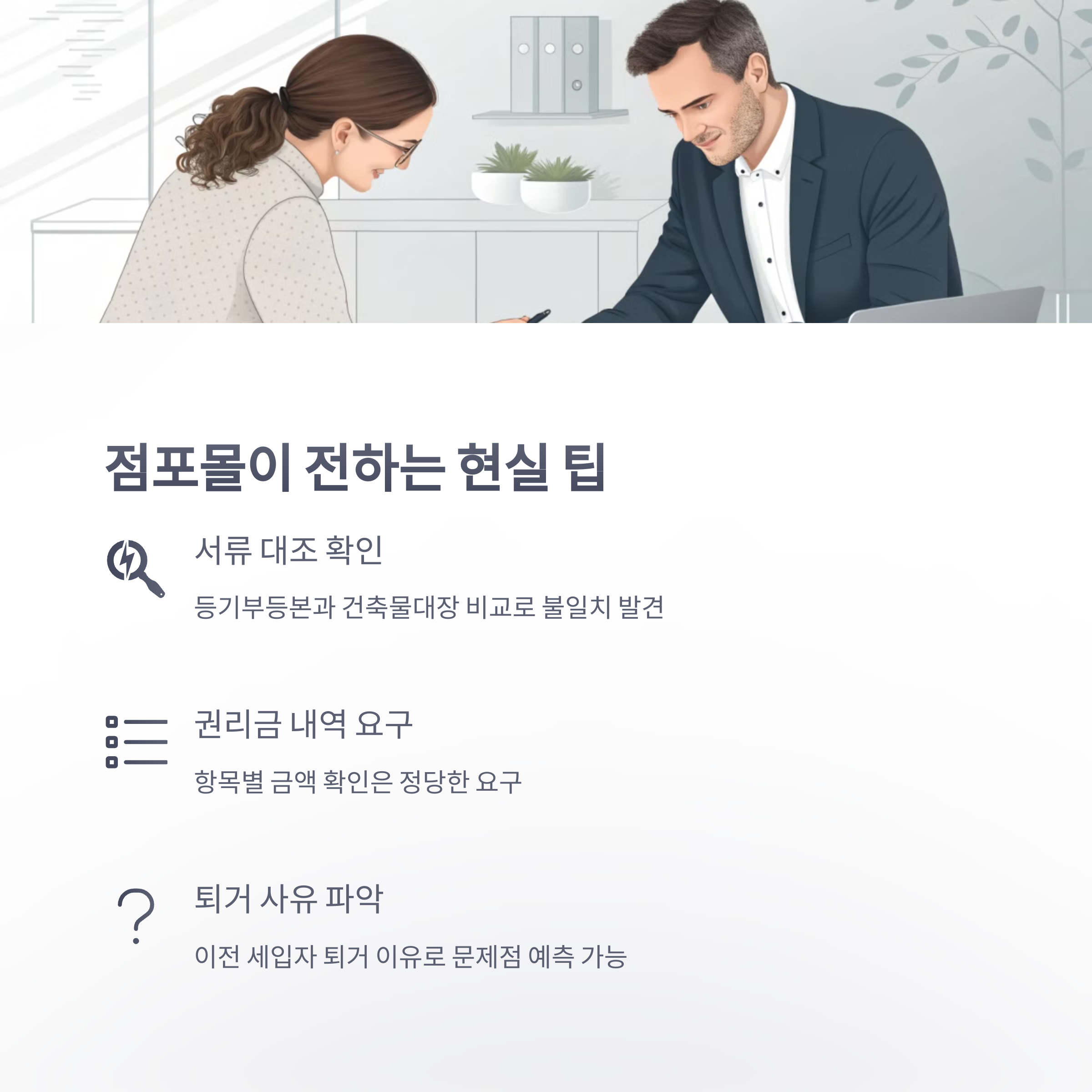 중개인의 말만 믿는 것은 위험합니다. 법적 책임은 결국 본인에게 있기 때문에 반드시 서류 확인과 제3자의 분석이 필요합니다.