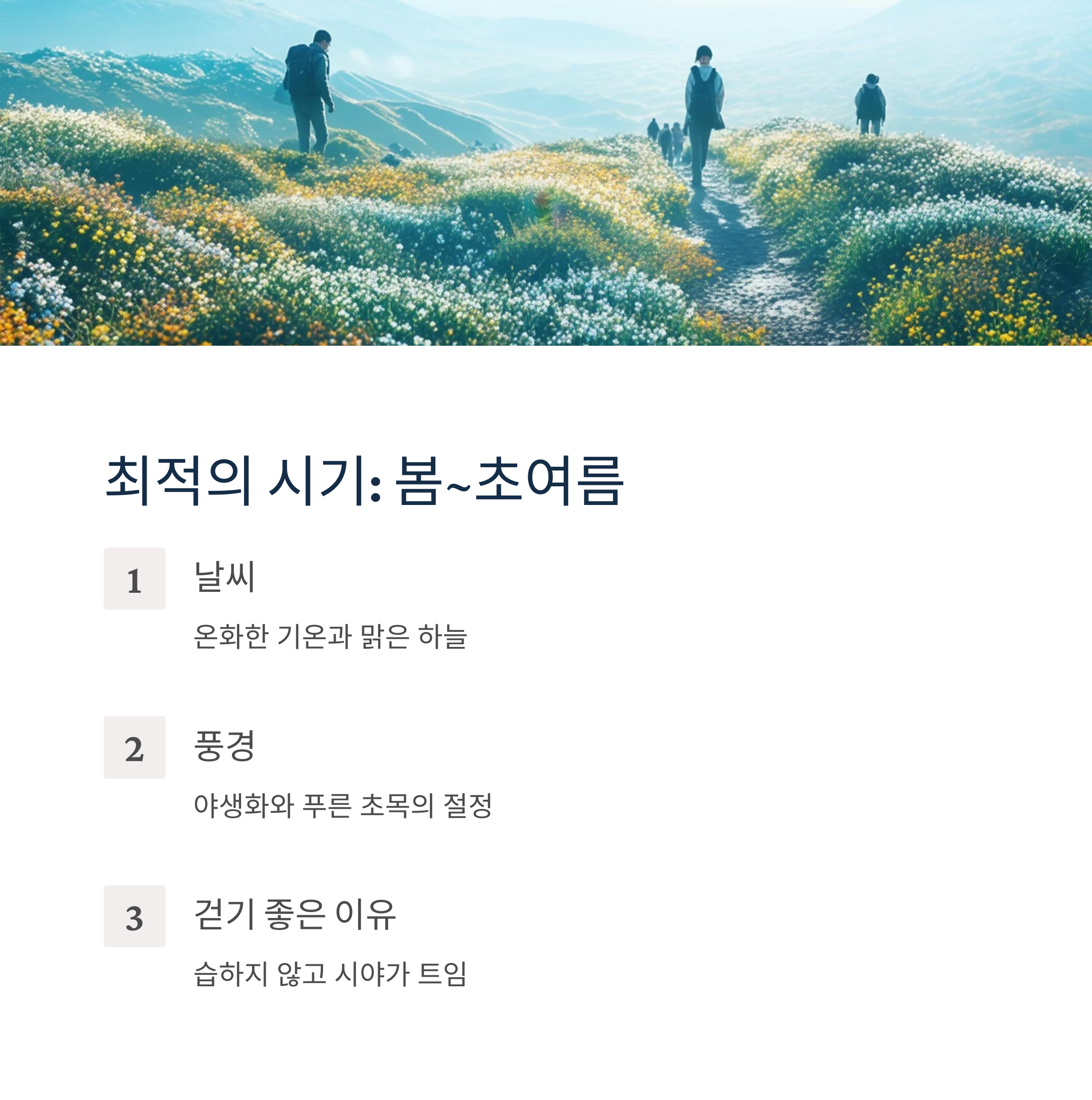 봄~초여름의 맑고 따뜻한 날씨가 가장 걷기 좋은 시기이며,