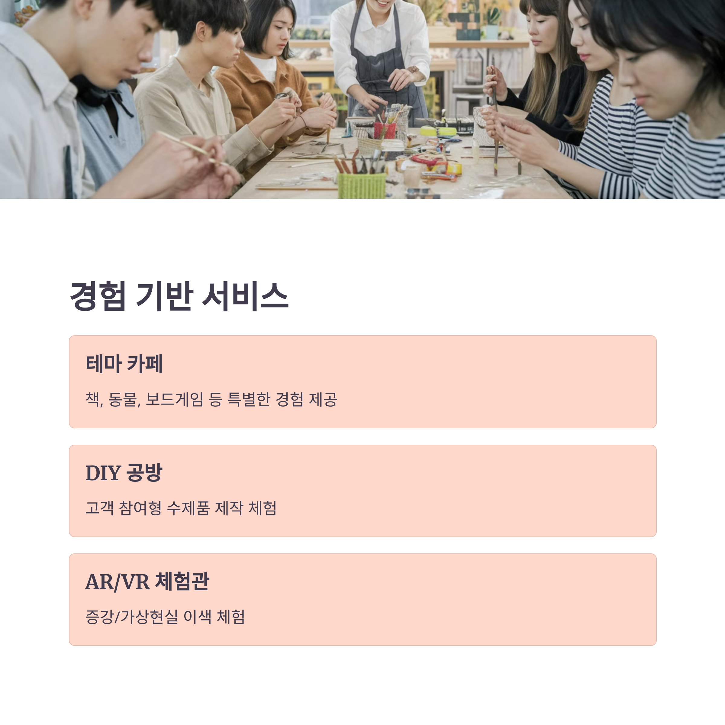 | 테마 카페 | 고객이 특정 테마(책, 동물, 보드게임 등)와 함께 즐길 수 있는 공간 |