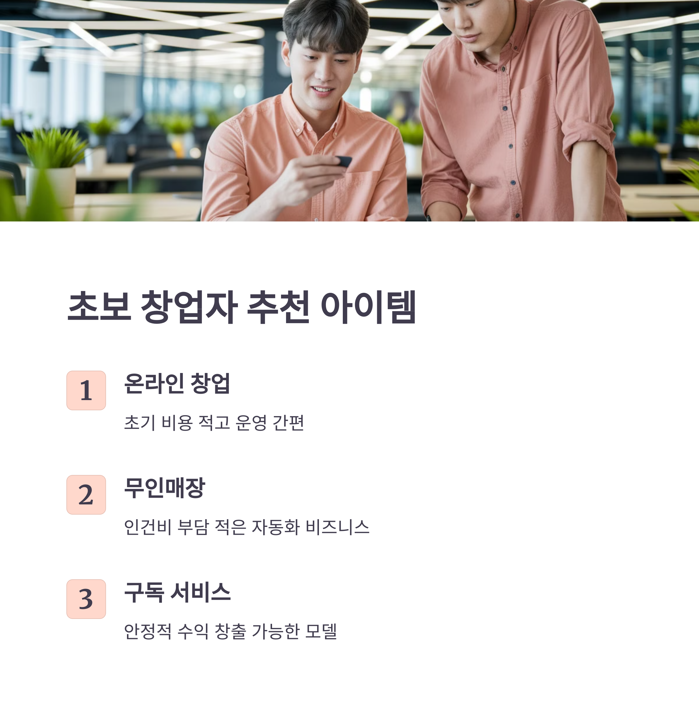 초기 비용이 적고 운영이 간편한 온라인 창업, 원격 서비스, 무인매장, 구독 서비스 등이 초보 창업자들에게 적합합니다. 특히 비대면 창업은 인건비 부담이 적고, 운영이 비교적 쉬운 편입니다.
