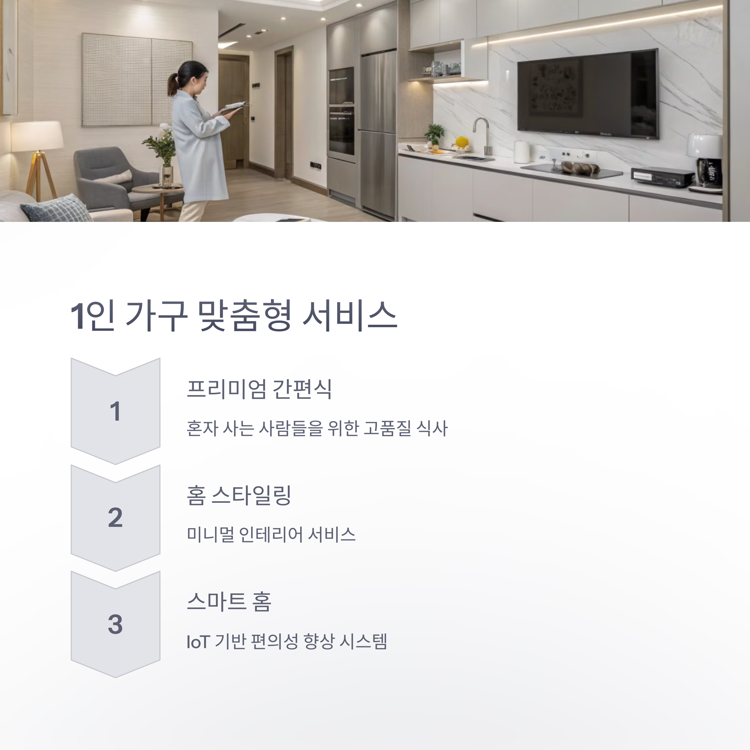 1인 가구를 위한 프리미엄 간편식, 스마트 홈 제품, 개인 맞춤형 헬스케어, 공유 오피스 및 1인 여행 관련 서비스 등이 높은 성장 가능성을 보이고 있습니다.