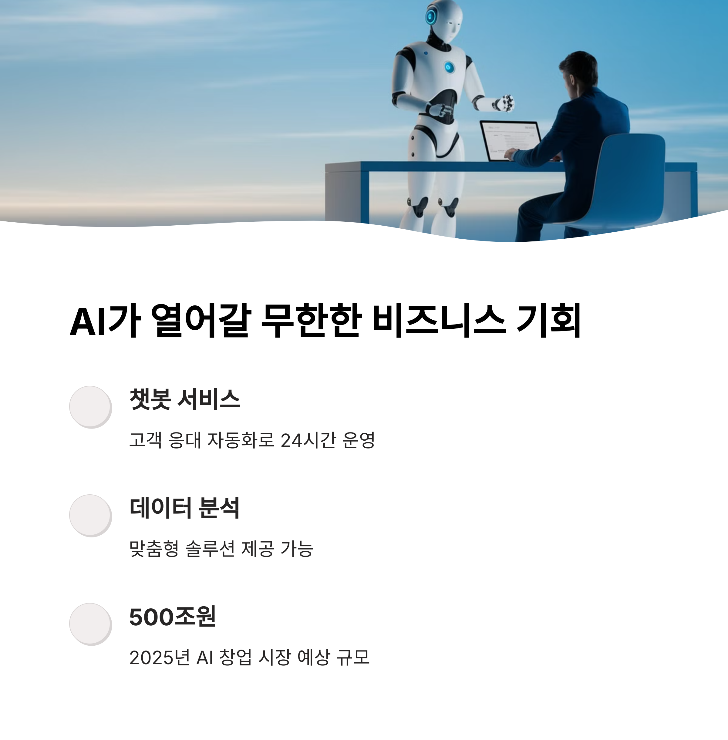 AI 기술이 발전하면서 창업 시장에서도 AI 기반 비즈니스가 급성장하고 있습니다. 챗봇을 활용한 고객 응대 서비스, AI 기반 데이터 분석, 자동화된 마케팅 솔루션 등 AI는 창업자들에게 업무 효율성을 극대화할 수 있는 기회를 제공하고 있습니다. 특히, 스타트업들이 고객 데이터를 활용하여 맞춤형 서비스를 제공하는 것은 2025년 창업 트렌드의 핵심이 될 것입니다.