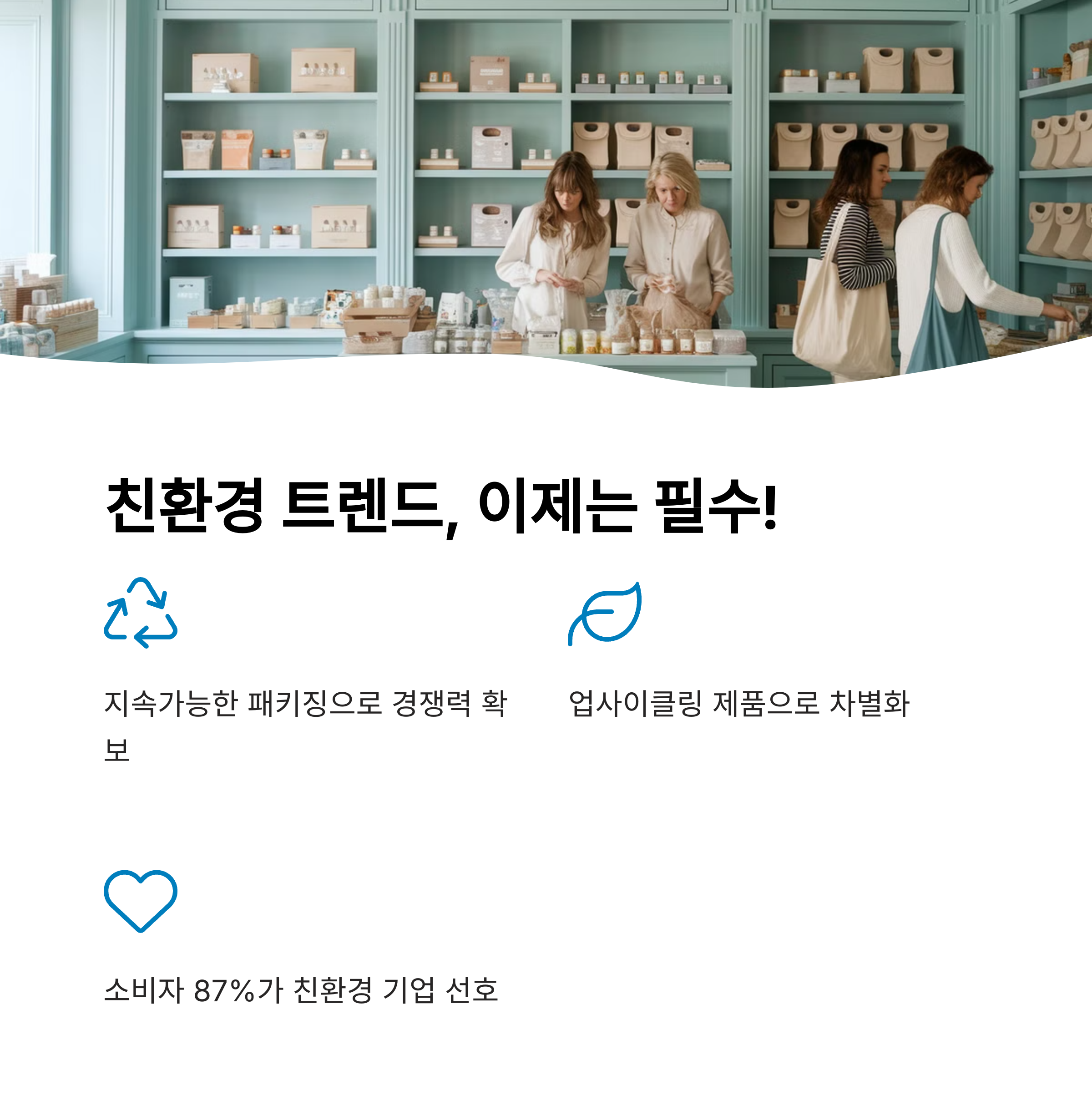 환경 보호에 대한 관심이 높아지면서 친환경 창업이 각광받고 있습니다. 제로 웨이스트(Zero Waste) 제품, 업사이클링(Upcycling) 브랜드, 전기차 충전소 사업 등 지속 가능한 비즈니스 모델이 소비자들에게 큰 호응을 얻고 있습니다.