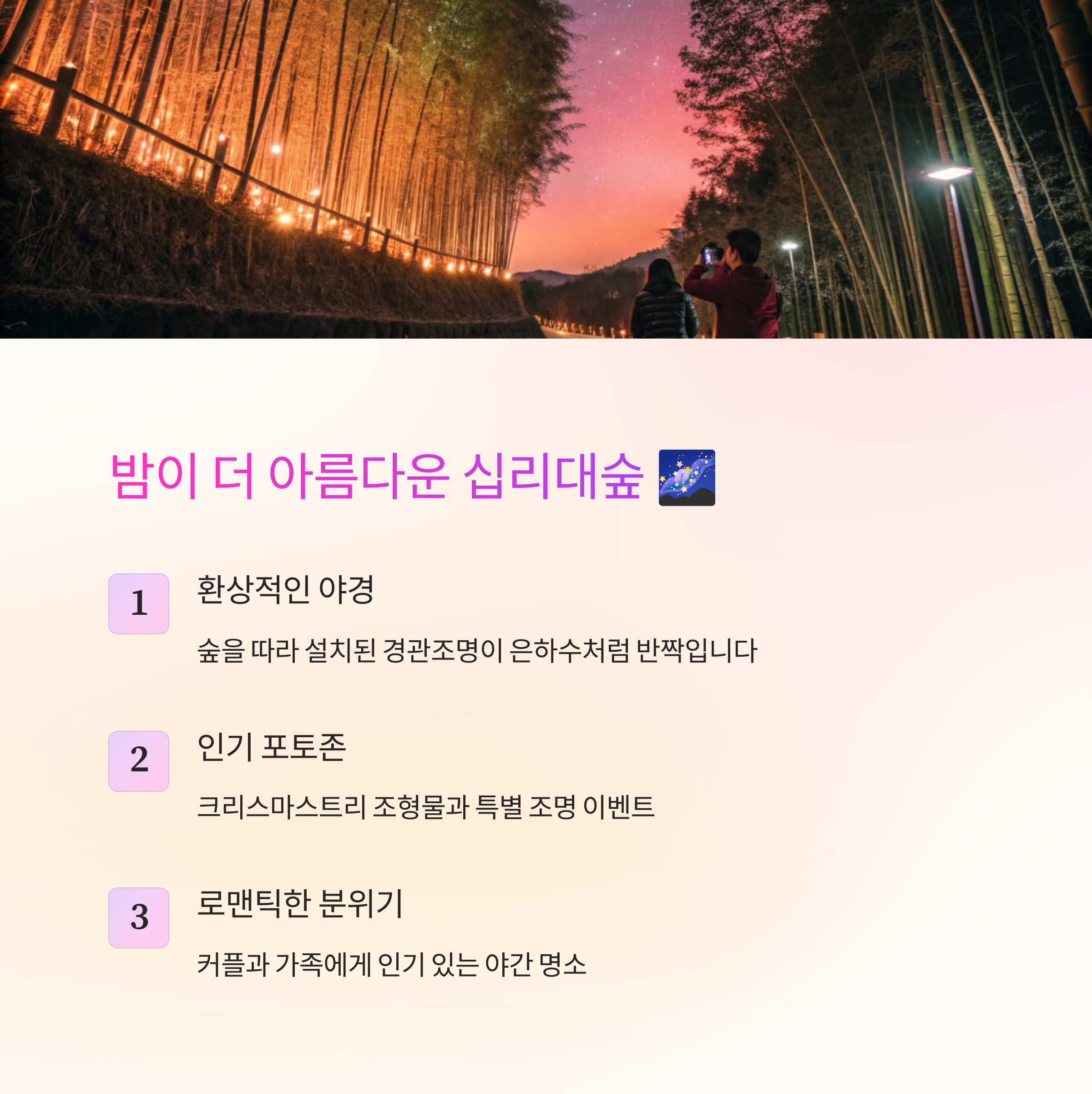 십리대숲은 낮에도 좋지만, 역시 이곳의 진짜 매력은 밤에 드러납니다. 특히 야간에는 숲을 따라 설치된 경관조명이 은하수처럼 반짝이며 환상적인 분위기를 만들어줘요. 은은한 조명 아래 산책을 하다 보면 어느새 감성 가득한 추억을 남길 수 있을 거예요. 특히 커플이나 가족 단위 방문객들에게 인기가 정말 많답니다.