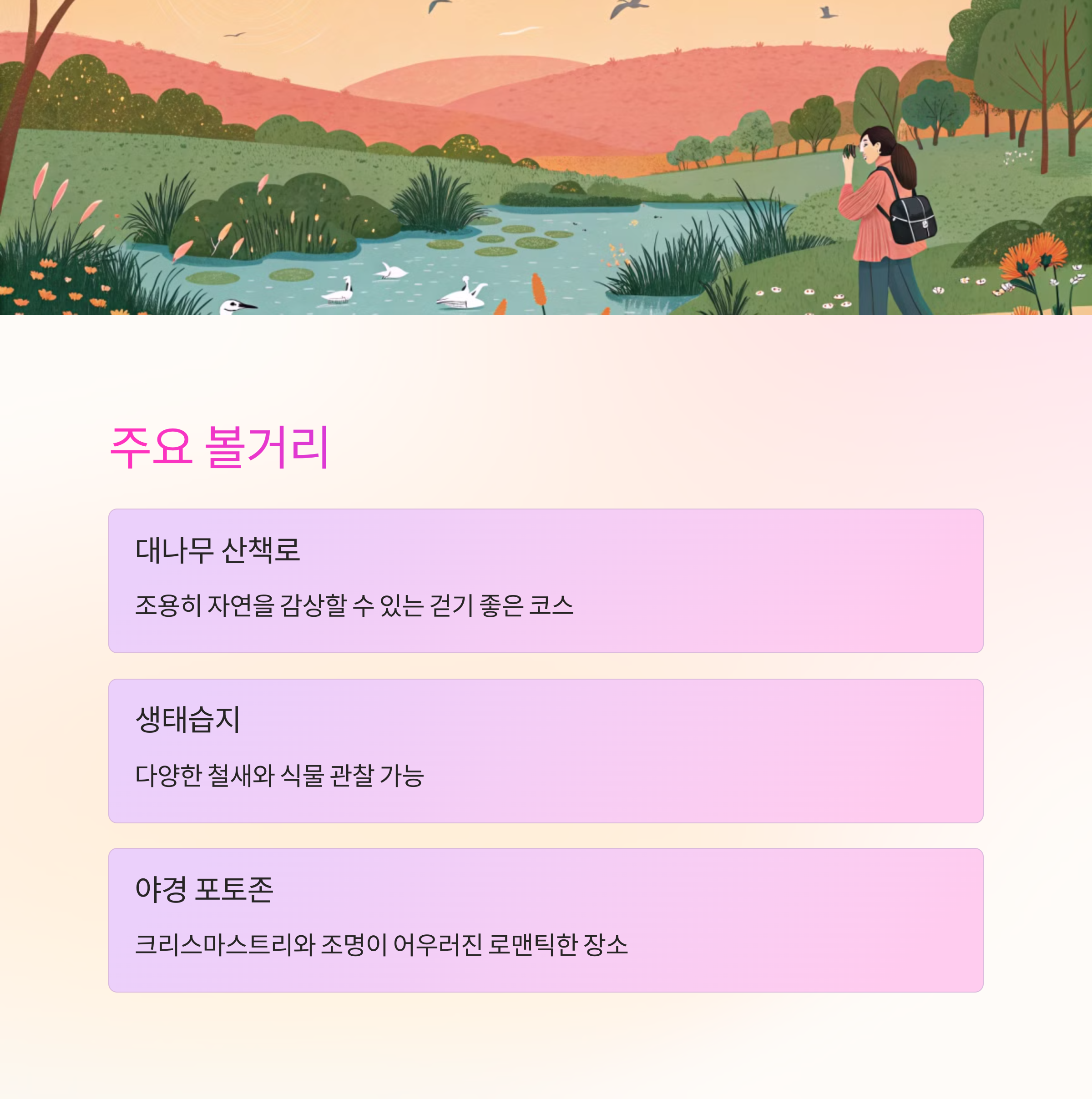 | 생태습지 | 다양한 철새와 식물 관찰 가능 |