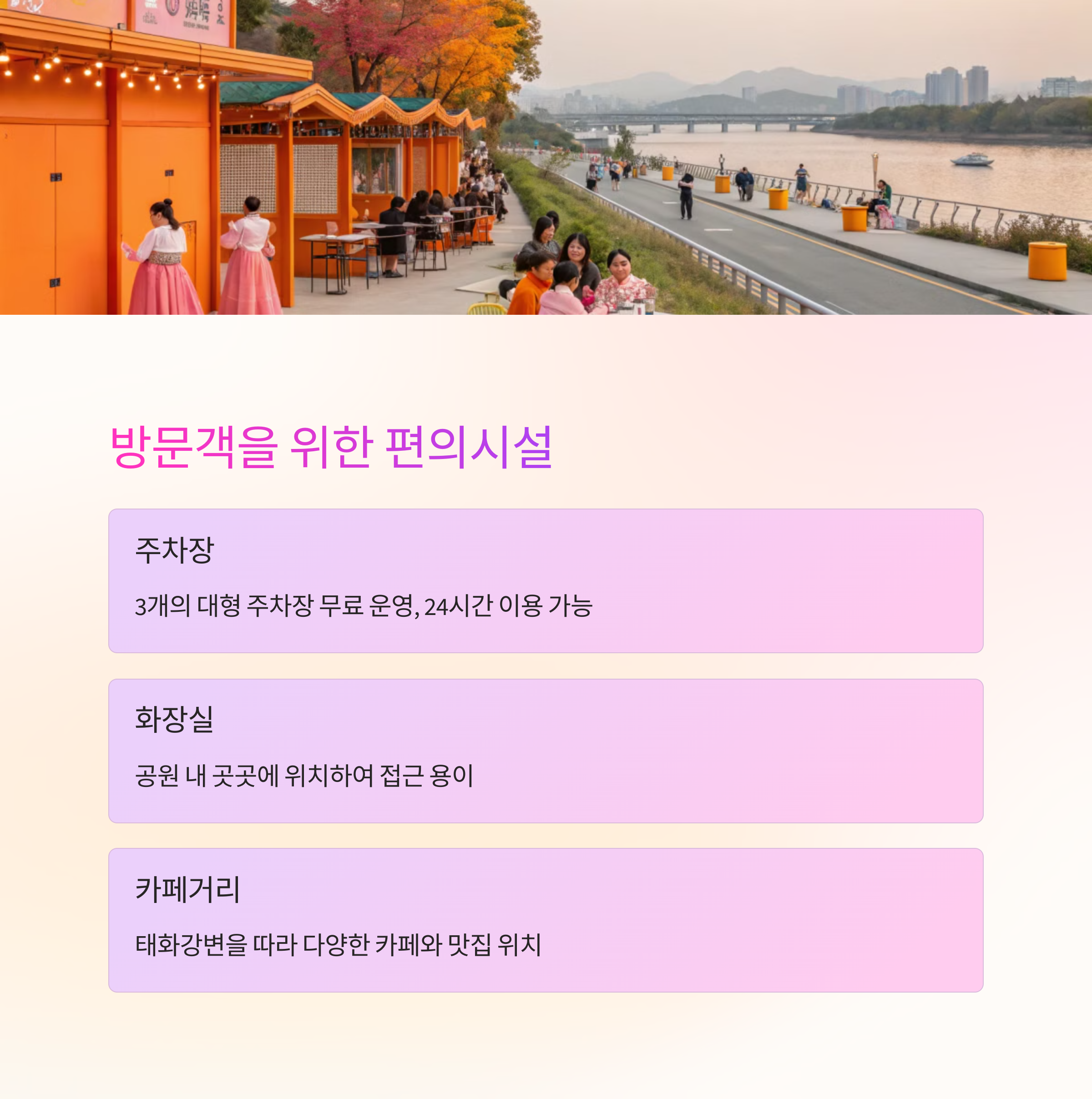 | 화장실 및 편의시설 | 공원 내 곳곳에 위치하여 접근 용이 |