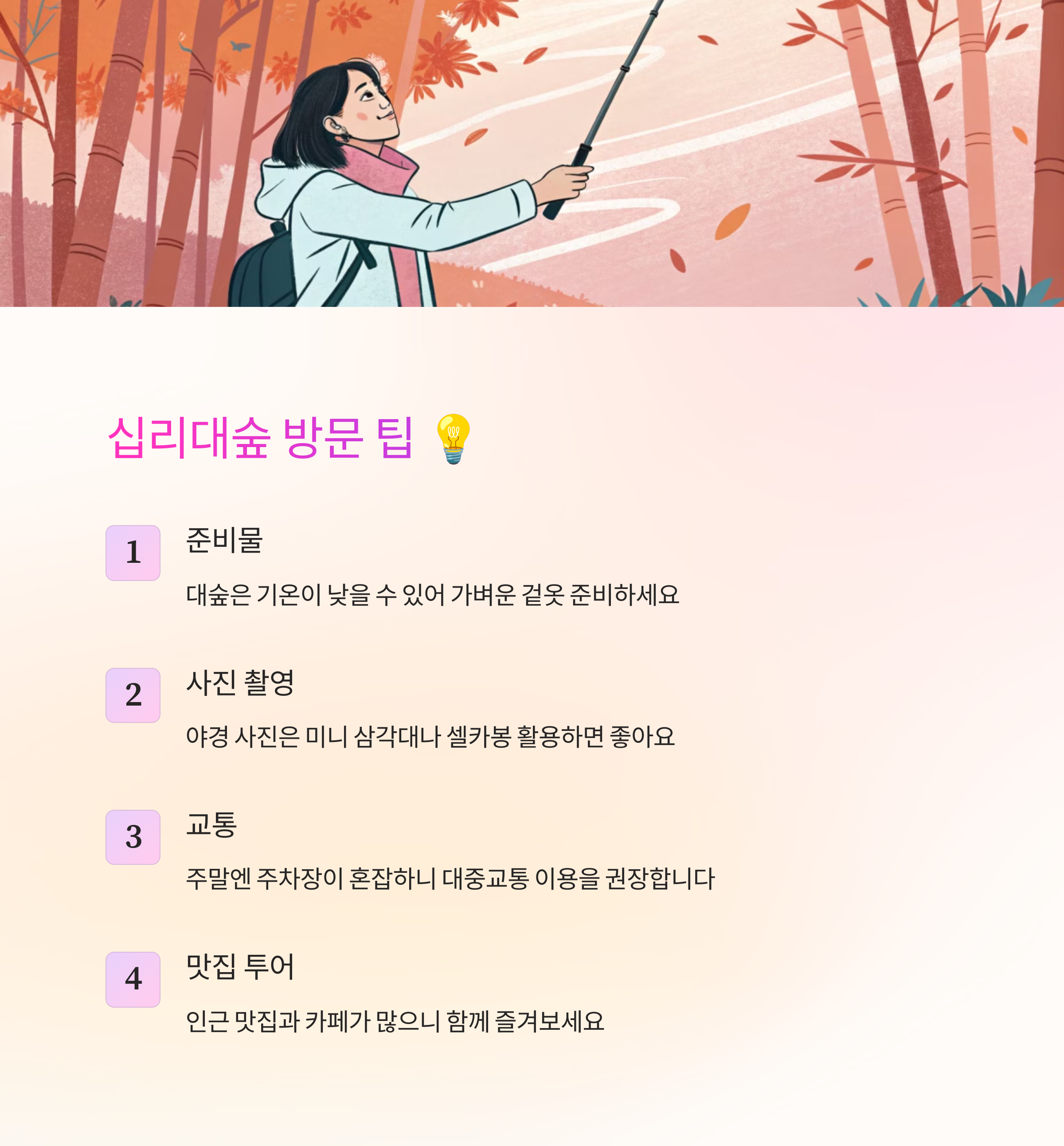 십리대숲을 더 즐겁게 즐기기 위한 몇 가지 유용한 팁을 알려드릴게요! 이 정보만 잘 기억하고 가시면, 더 편하고 알찬 나들이를 즐길 수 있어요.