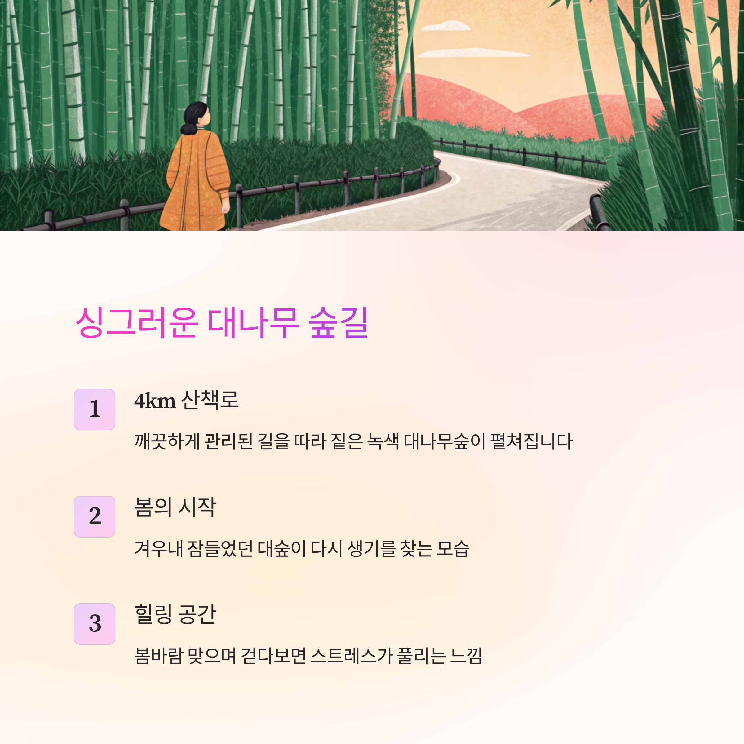 | 대나무 산책로 | 조용히 자연을 감상할 수 있는 걷기 좋은 코스 |