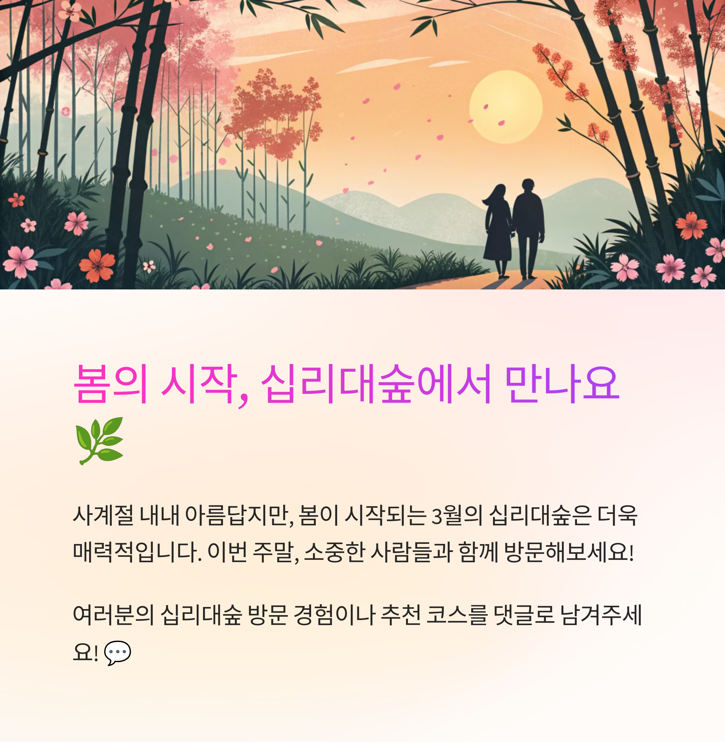 여러분은 십리대숲을 방문해본 적 있으신가요? 방문 경험이나 추천하고 싶은 코스를 댓글로 남겨주세요! 여러분의 소중한 이야기가 더 많은 사람들에게 도움이 될 거예요. 💬✨