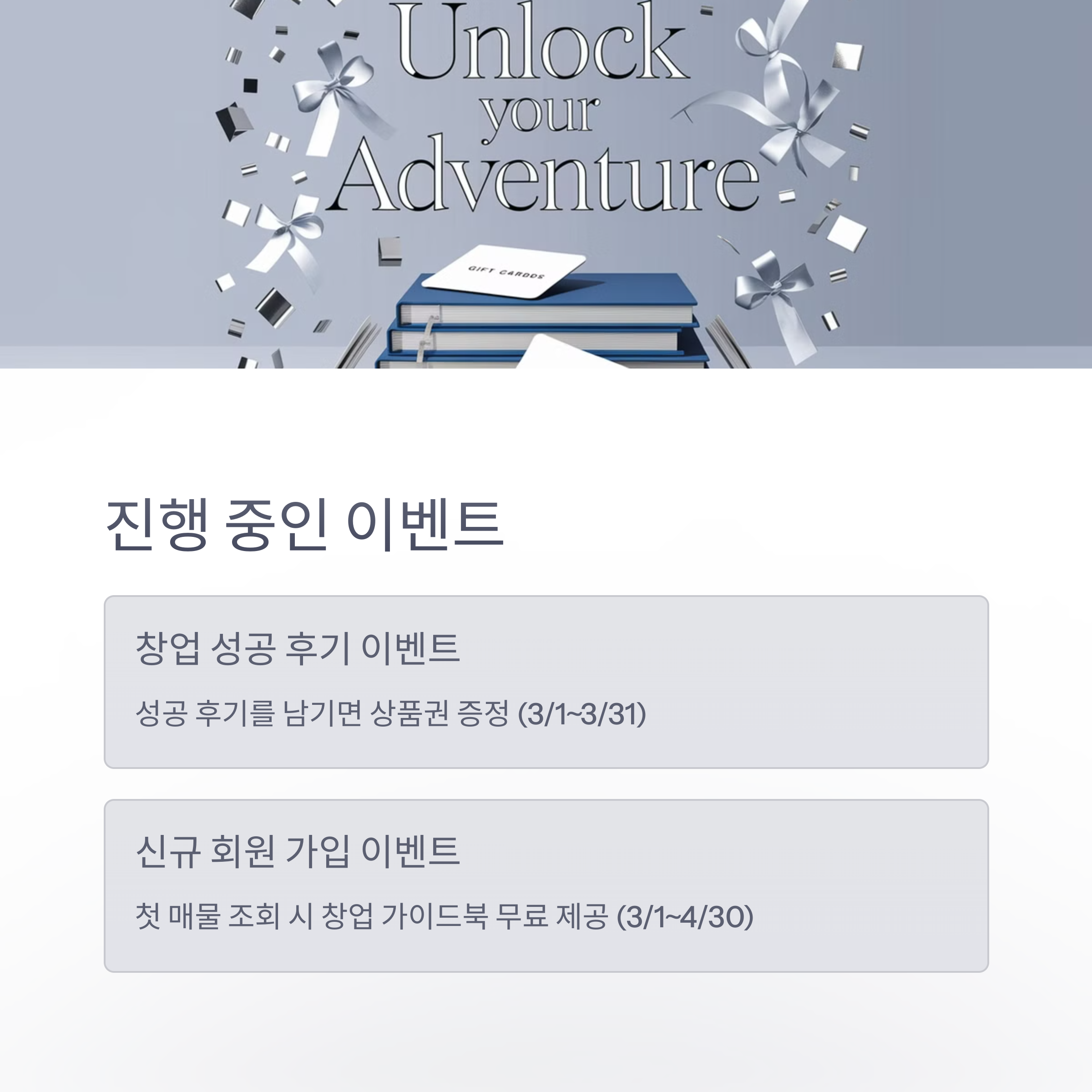 | 신규 회원 가입 이벤트 | 신규 가입 후 첫 매물 조회 시 창업 가이드북 무료 제공 | 2025년 3월 1일 ~ 4월 30일 |